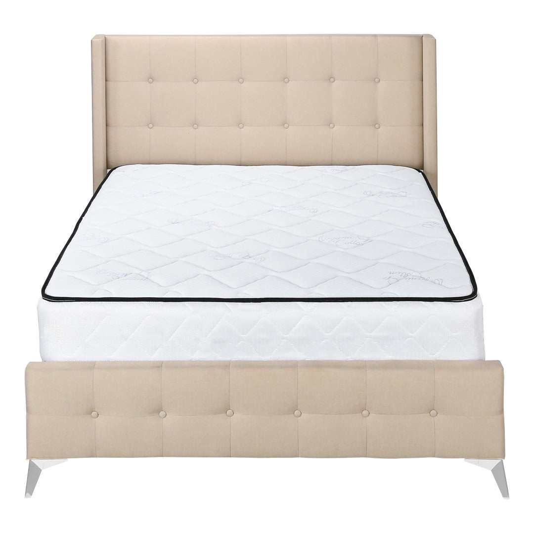 - Queen size contemporary platform bed, upholstered in a chic beige linen-look fabric over foam padding on all sides, with luxurious button tufting on the wingback headboard and curved footboard