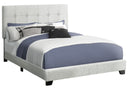 - Upholstered, queen size bed frame in a trendy light grey boucle fabric with black block feet, bringing fashionable style to a transitional bedroom decor.