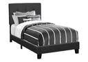 - Upholstered, twin size bed frame in a trendy black boucle fabric with black block style plastic feet, bringing fashionable style to a youth or teen bedroom.