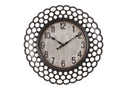 - A trendy and eye-catching 16" round wall clock with a sleek dark brown plastic frame with circular cut-outs adds a modern touch to any room.