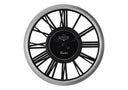 - Durable silver gray plastic frame with a glass surface, and black metal hands attached to a black vintage style backdrop for a decorative flair.