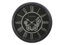 - Crafted with a durable plastic frame in a classic black finish, with grey metal gears and metal hands under a clear glass surface, perfect for trending home decors.