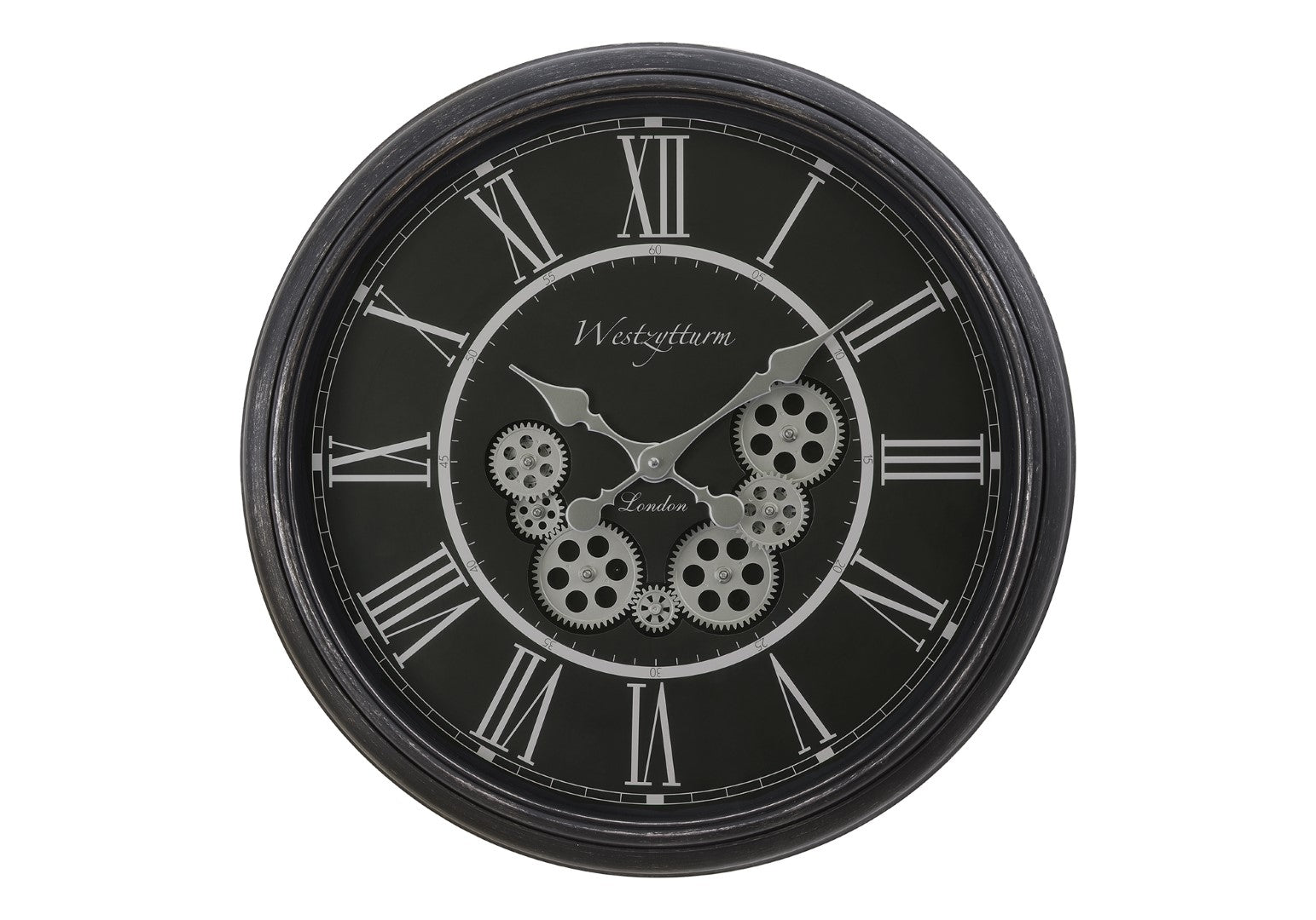 - Sleek with a transitional style, this 23" round wall clock features a stunning moving gear mechanism design, for a timeless decorative accent.
