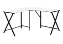 - Contemporary, L shape 55"l computer desk features a large desktop in a two tone white laminate finish with a rounded corner panel and a sturdy black metal base.