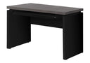 - A contemporary 48"L computer desk in a wood-look black and grey laminate, finished on all sides, fits perfectly in a small home office, bedroom, or dorm.