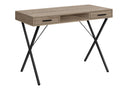 - This brown reclaimed wood-look desk features a contemporary X-design black metal base that ensures sturdiness