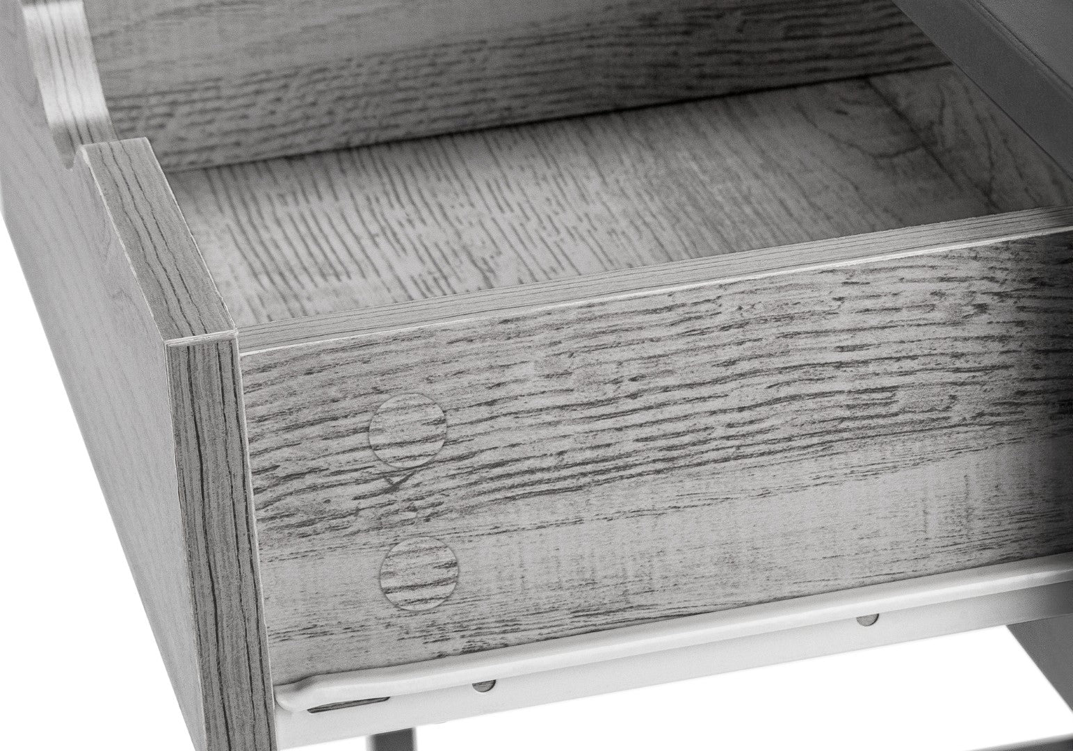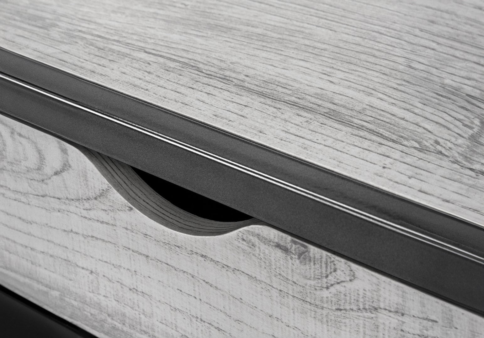 - Slender metal frame in a black finish provides stability and contrasts the grey stone-look laminate panels