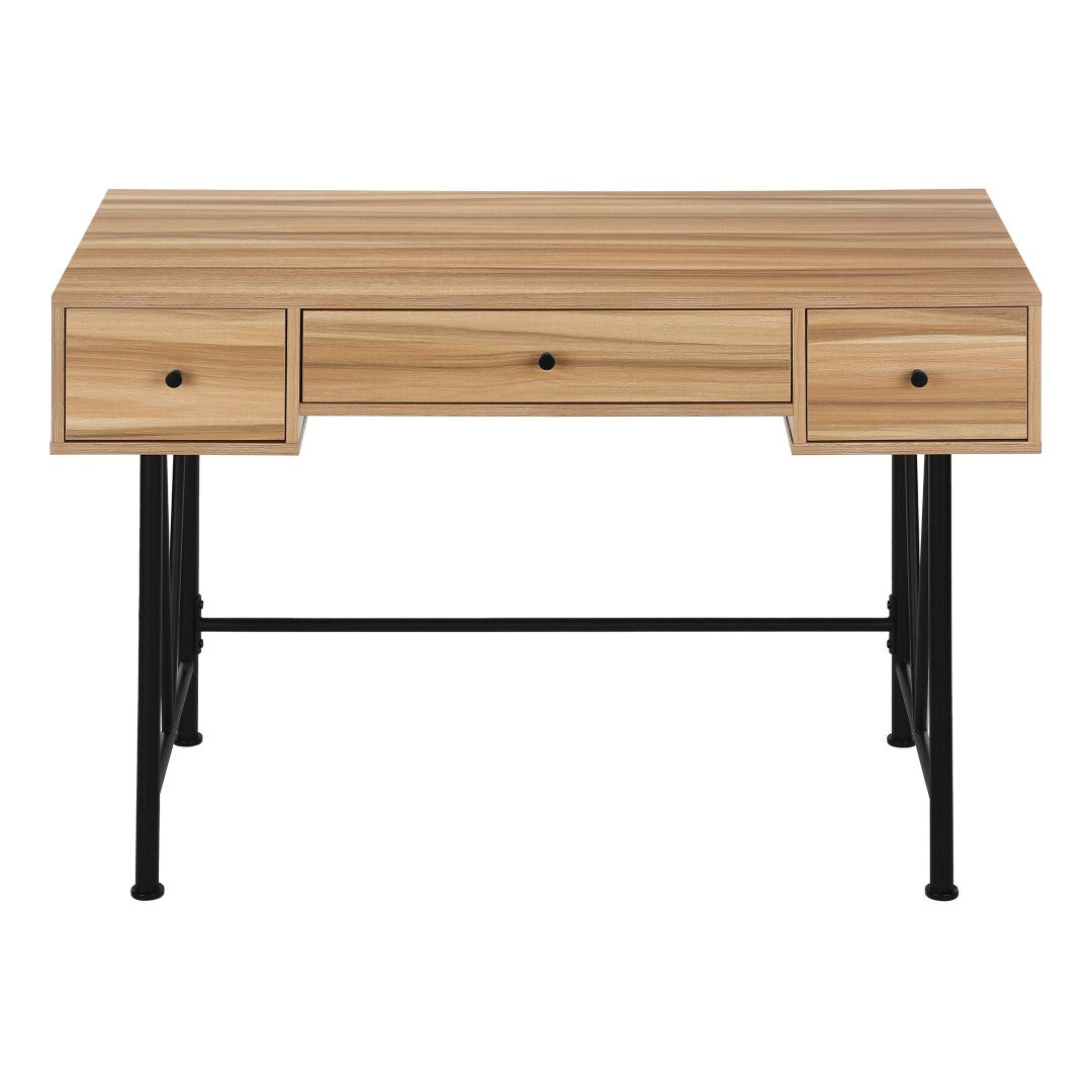 - Thick paneled computer desk finished in a warm cherry wood-look, with attractive black metal legs