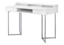 - Smooth spacious desk top in a chic white finish for a laptop, lamp, and writing essentials