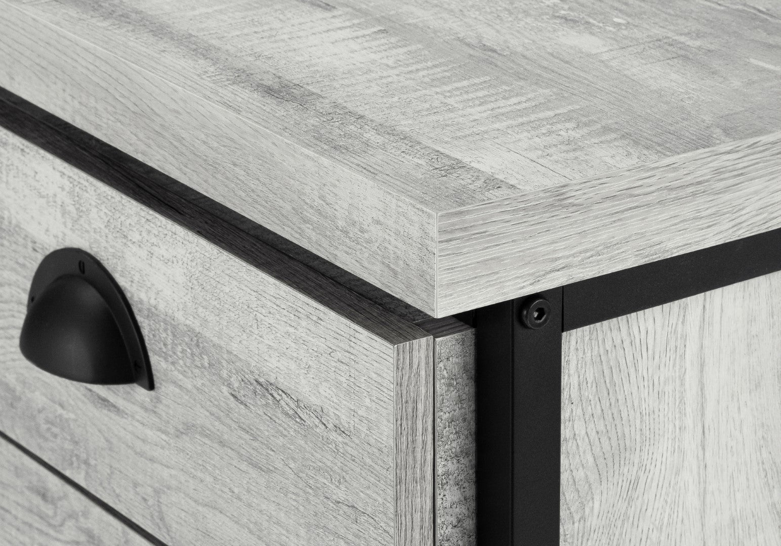 - 3 storage drawers on metal glides with retro-inspired black metal cup pulls