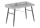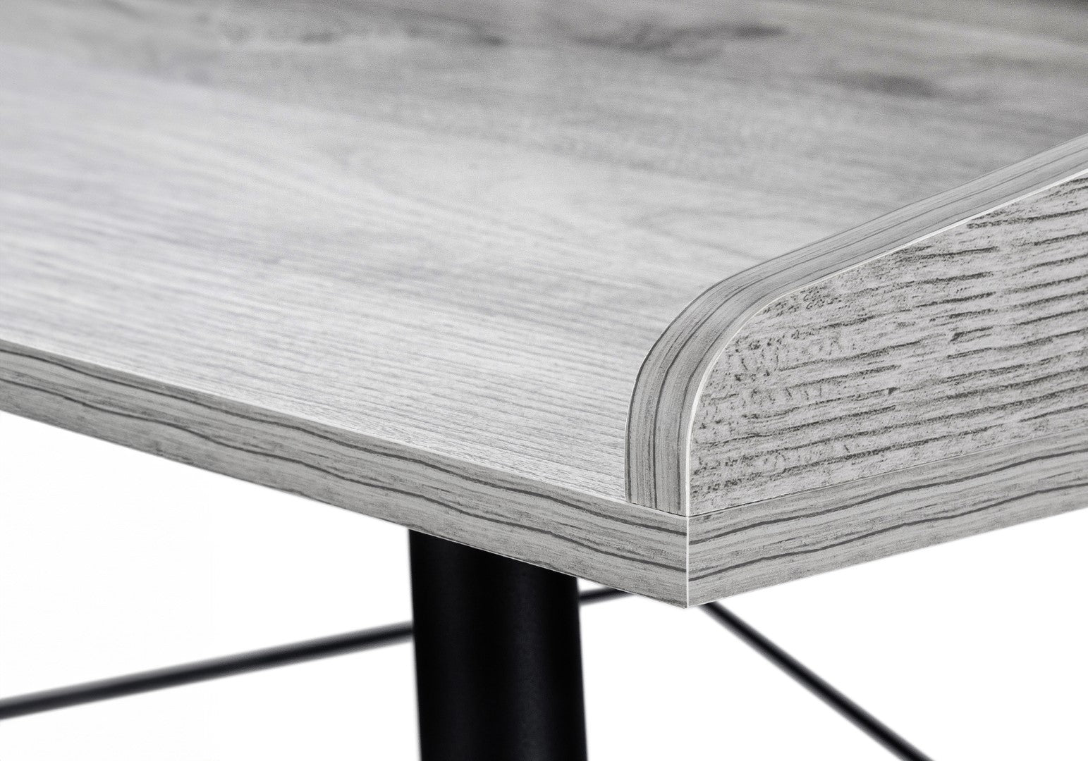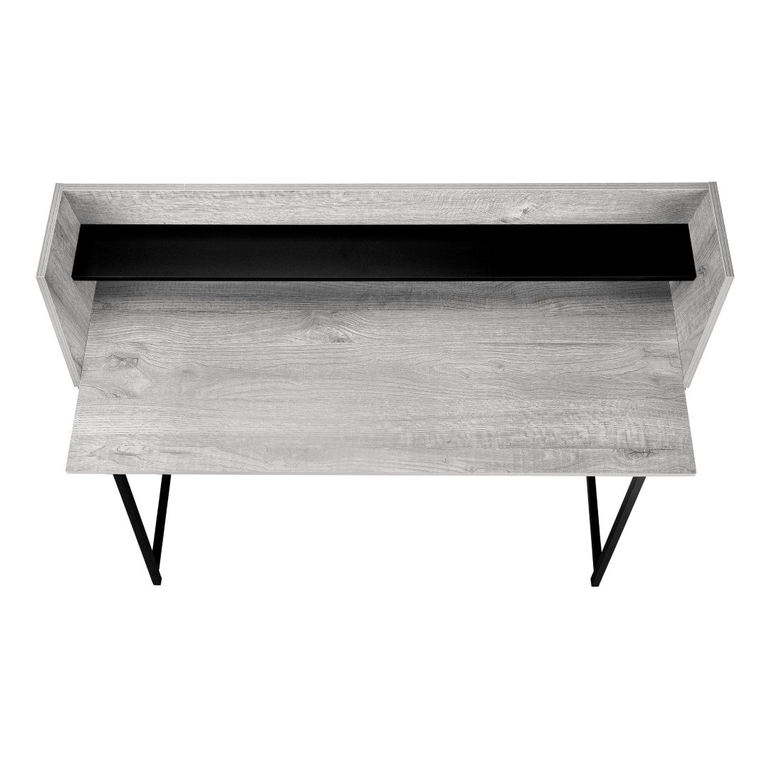 - Computer desk in a grey wood-look finish featuring a small hutch with 1 long shelf in a black finish