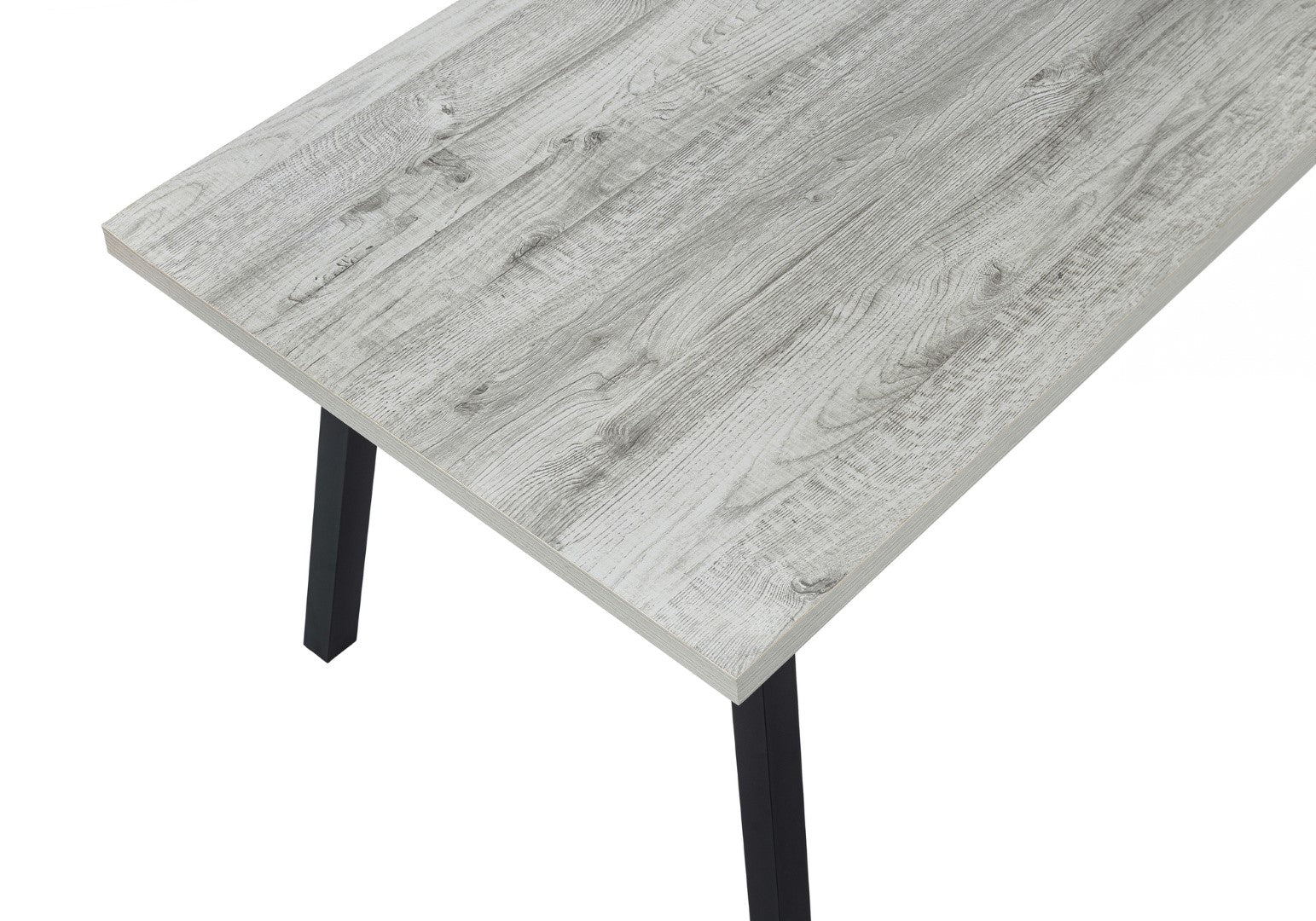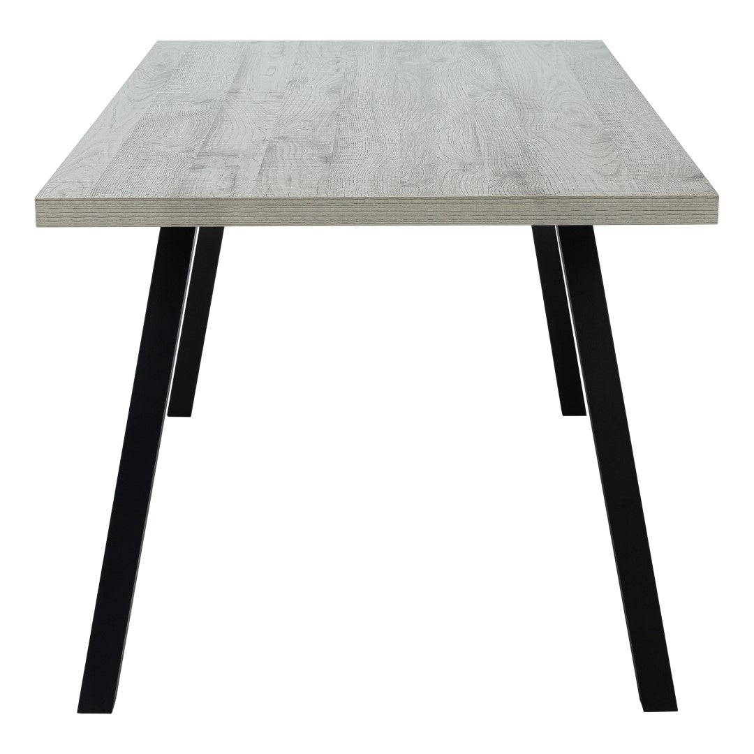 - Thick and sturdy construction finished in grey with durable black metal legs that offer a contemporary touch to this industrial dining table.