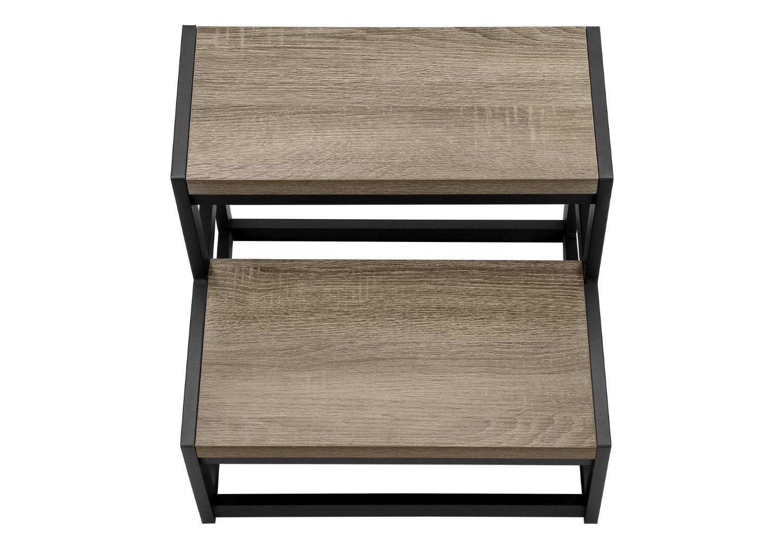 - The wide steps are finished in a warm brown wood-look laminate and framed in sturdy and strong black metal with protective floor pads to safely step up and reach for those precious stored items.