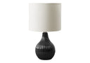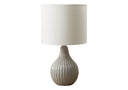 - This 17"h table lamp features a chic, lustrous beige ceramic base in a tear drop shape with a textured ribbed design, perfectly complemented with an ivory fabric shade, adding a fashionable touch to your living room, bedroom, or office.