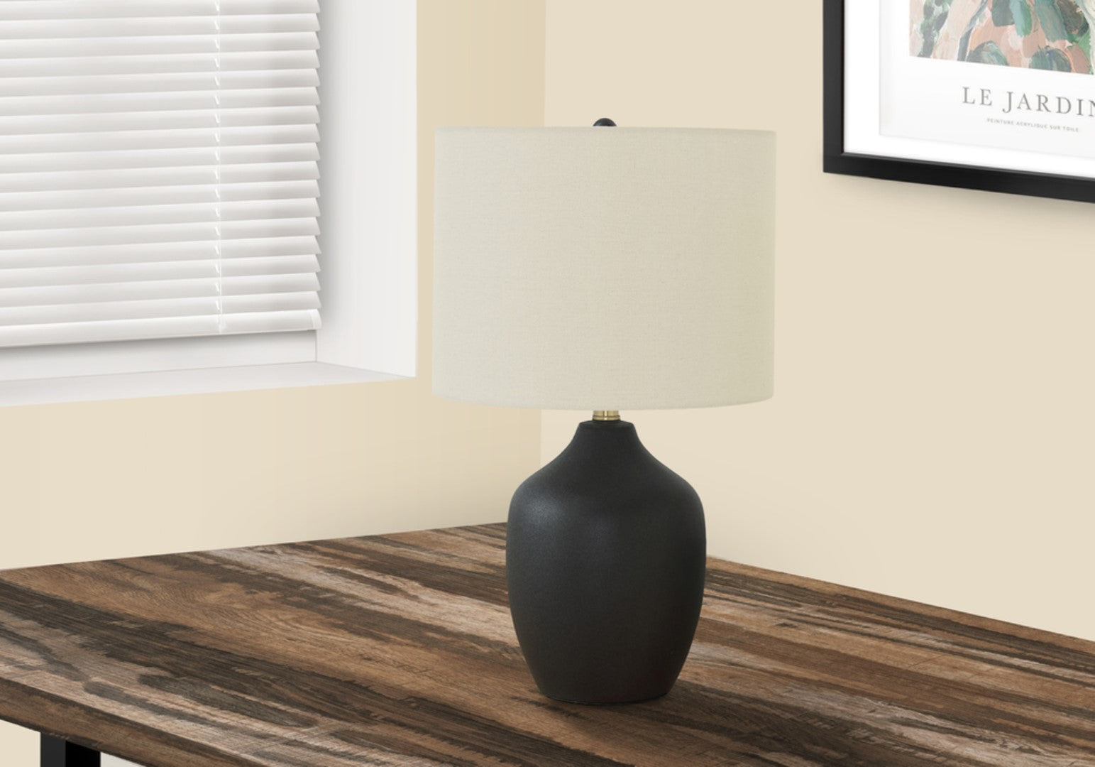 - The smooth and stylish black ceramic base and an ivory linen fabric drum shade, accented with a round black finial on top gives a chic refinement to any space.