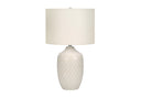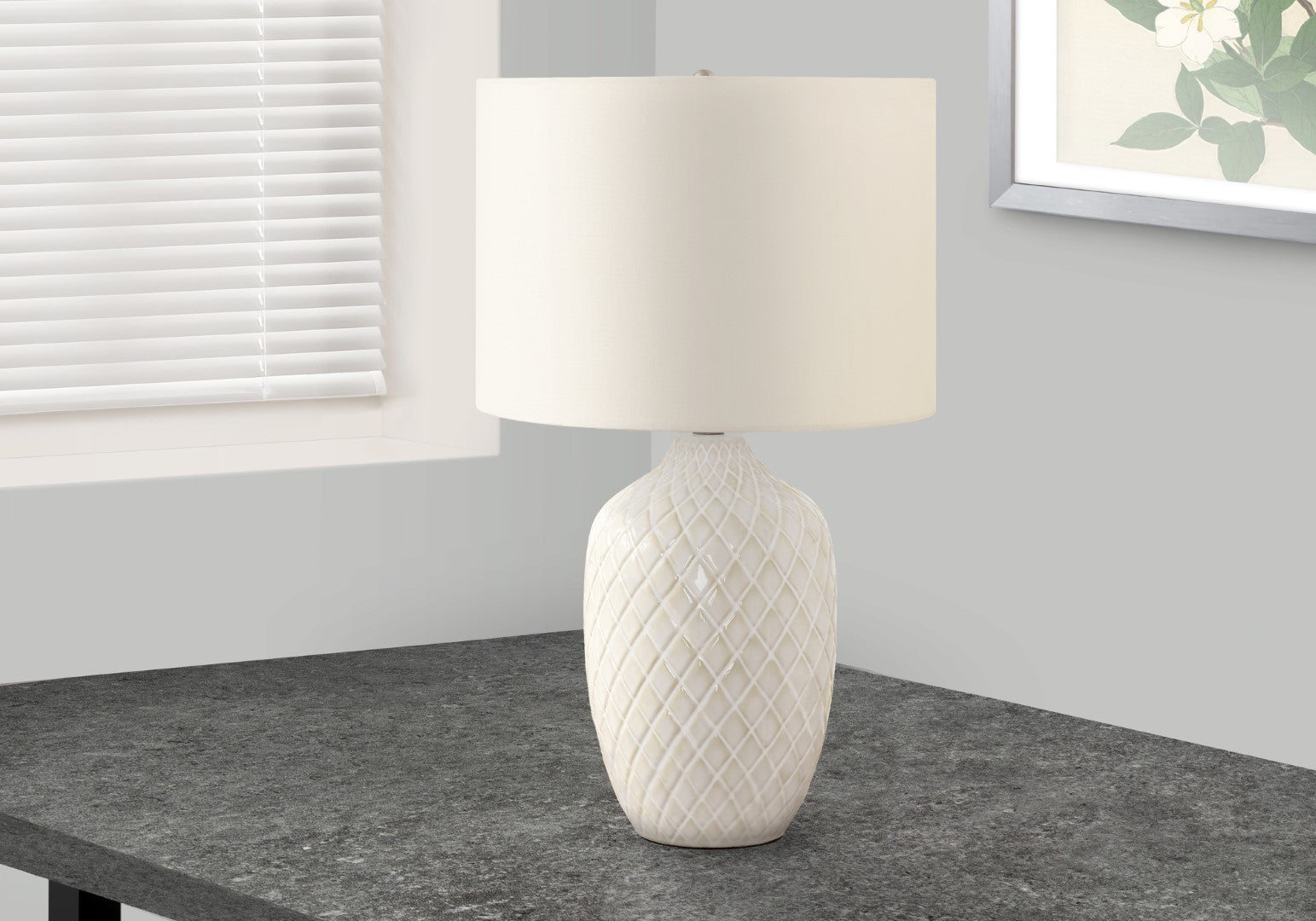 - Bring some warmth and illumination to your living room, bedroom, or home office with this stylish 25"h transitional table lamp in a elegant ginger jar shape, finished in a textured glazed cream ceramic with a simple ivory drum shade and silver finial on top.