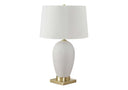- Elevate your home with this transitional style, 26"h white ceramic table lamp with a textured finish and a stylish gold metal finial and base attached to a clear 6ft long cord.