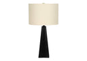 - A sleek design and modern black resin triangular base, topped with a beige linen drum shade and finished with a gold finial, this 28"h table lamp makes the perfect statement in a contemporary living space.