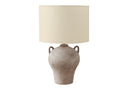 - This 22"h table lamp features a striking, mottled brown ceramic base shaped like an ancient jug, paired with a contemporary beige fabric shade, for a stylish addition to any living room, bedroom, or home office decor.