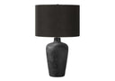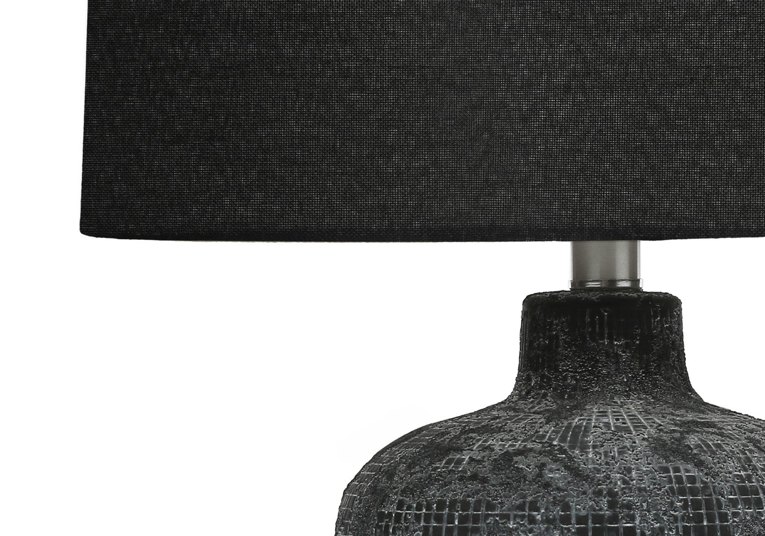 - Designed in a vase shape, this textured black ceramic table lamp, topped with a black fabric shade and finished with a round black finial on top, will bring sophisticated style to any living room, bedroom, or office space.