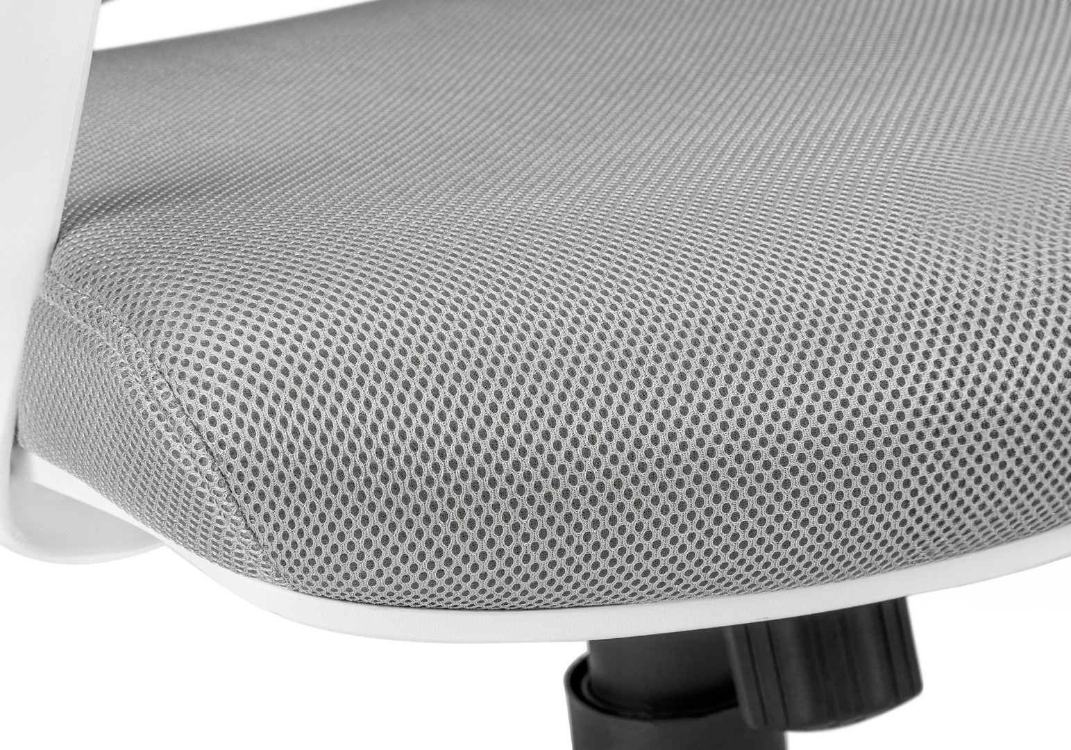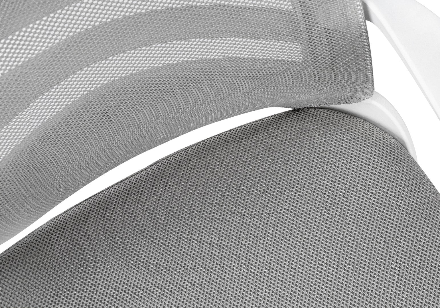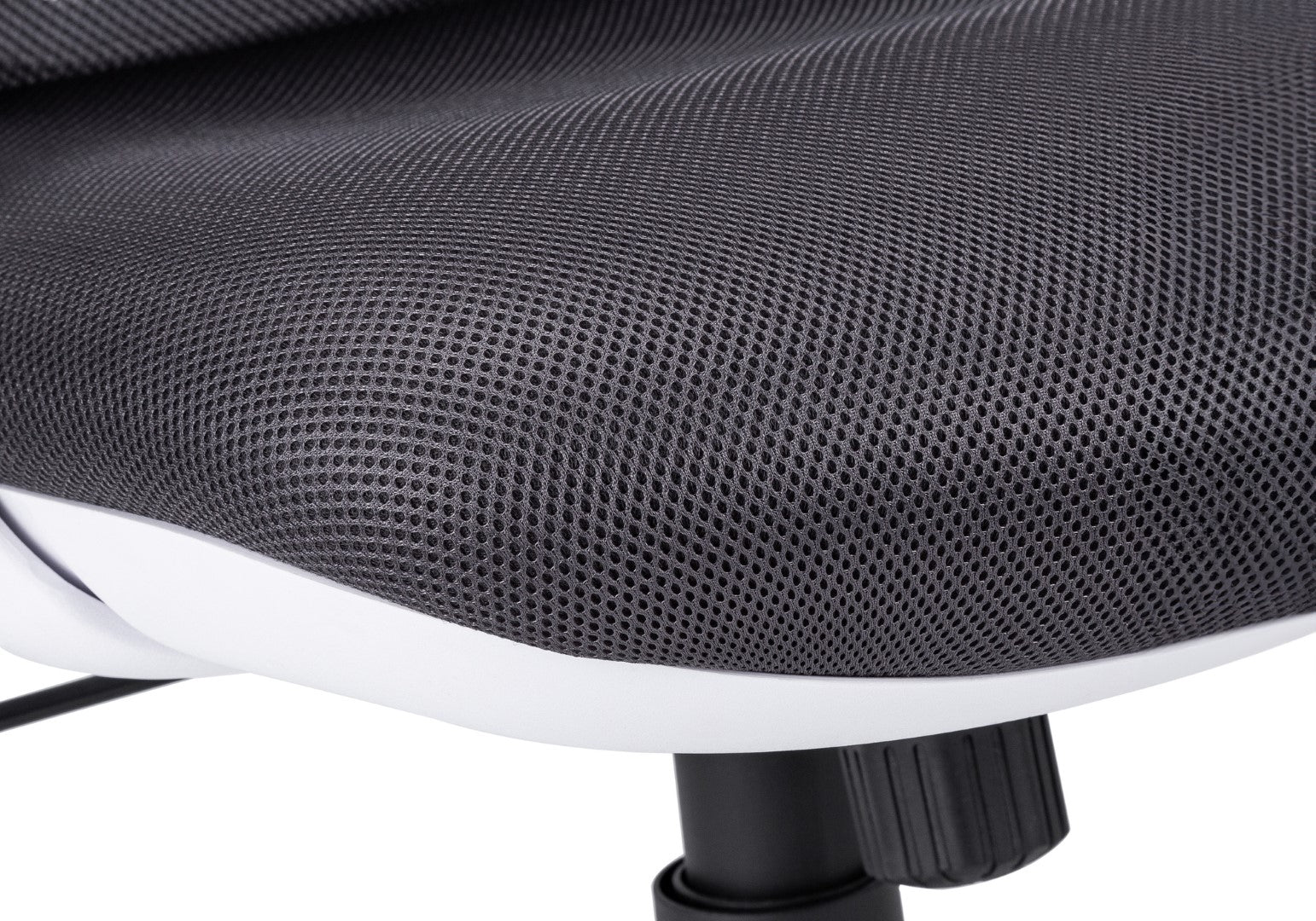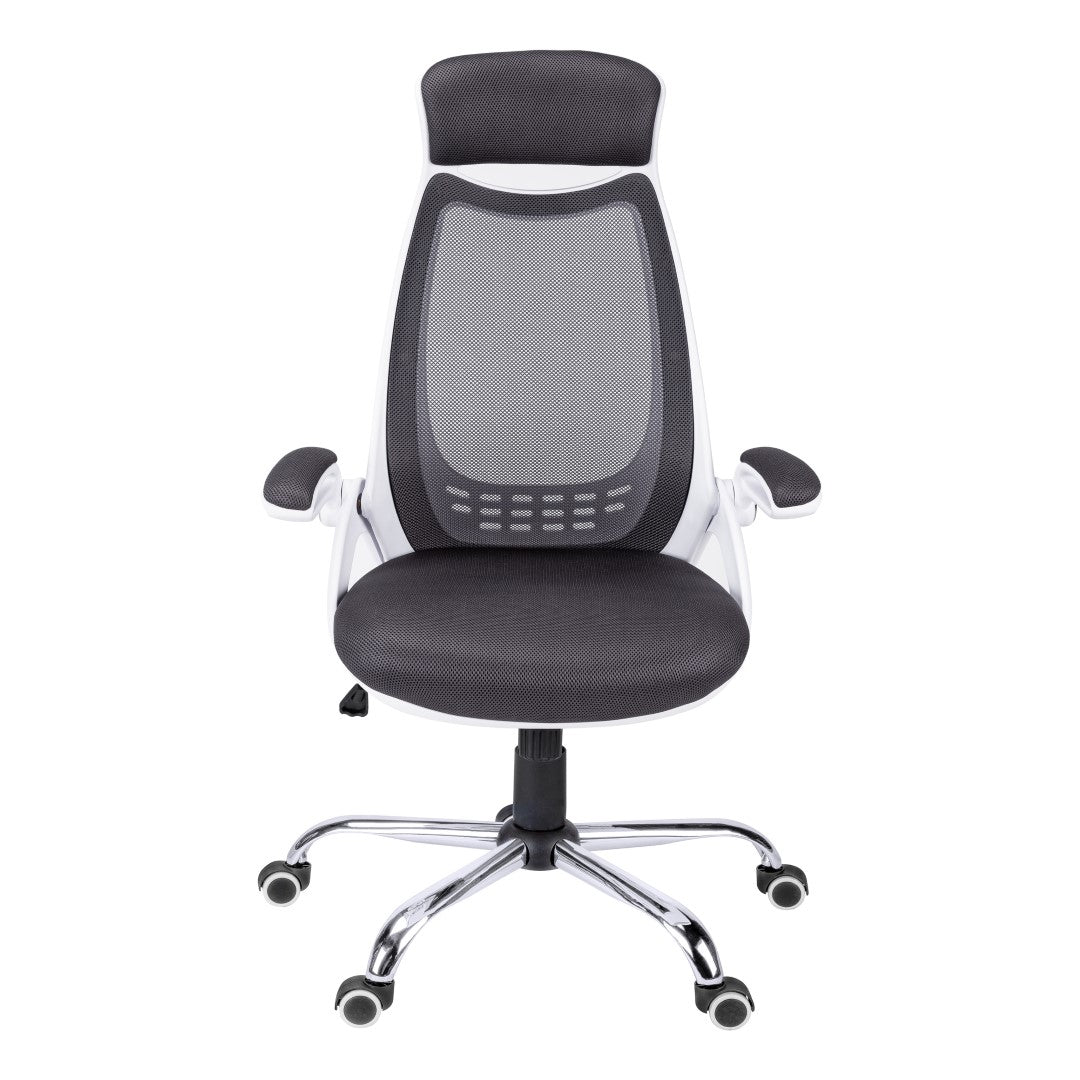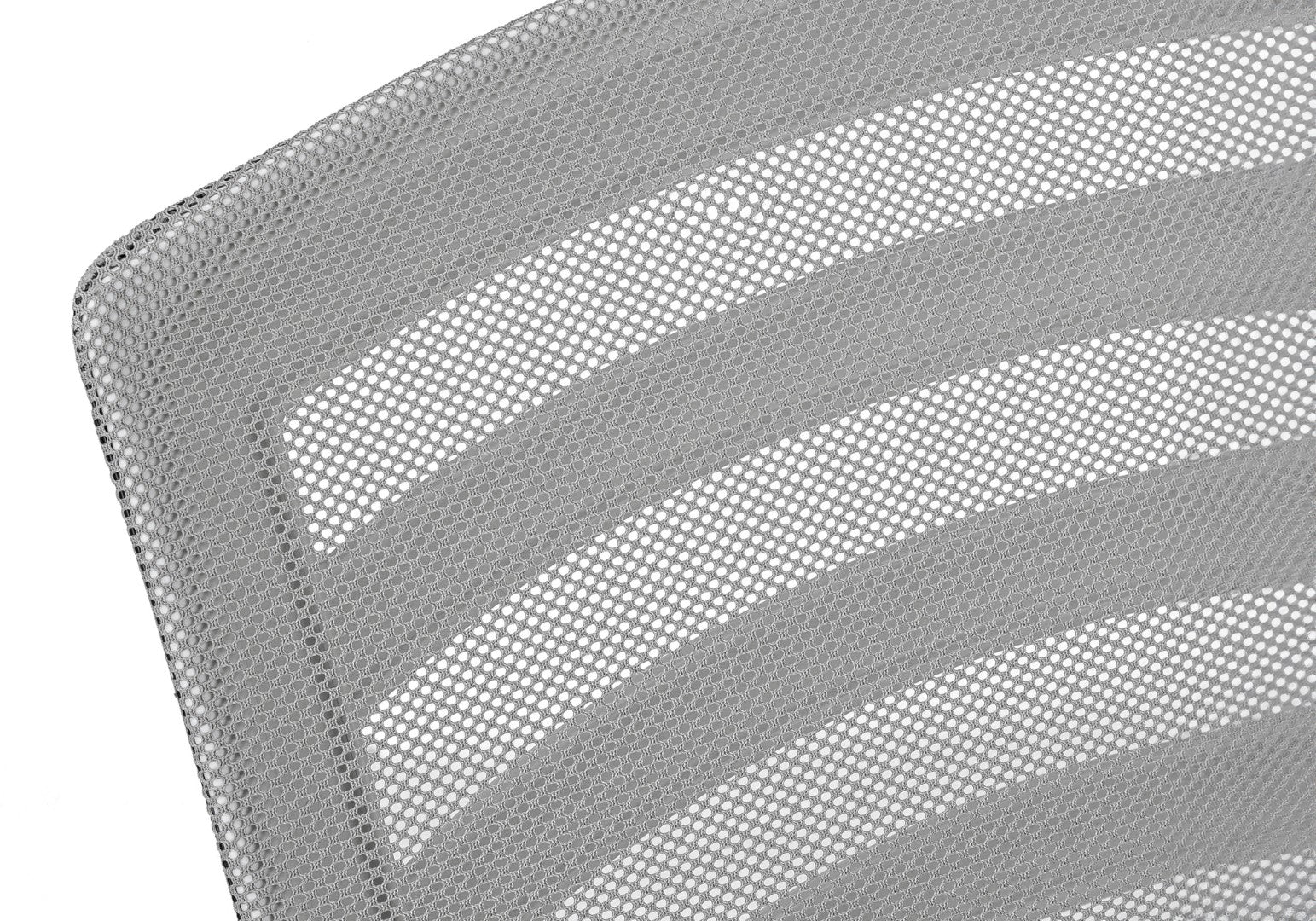 - High-back executive office chair in a commercial grade, durable, stain-resistant, and breathable grey polyester mesh fabric