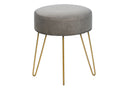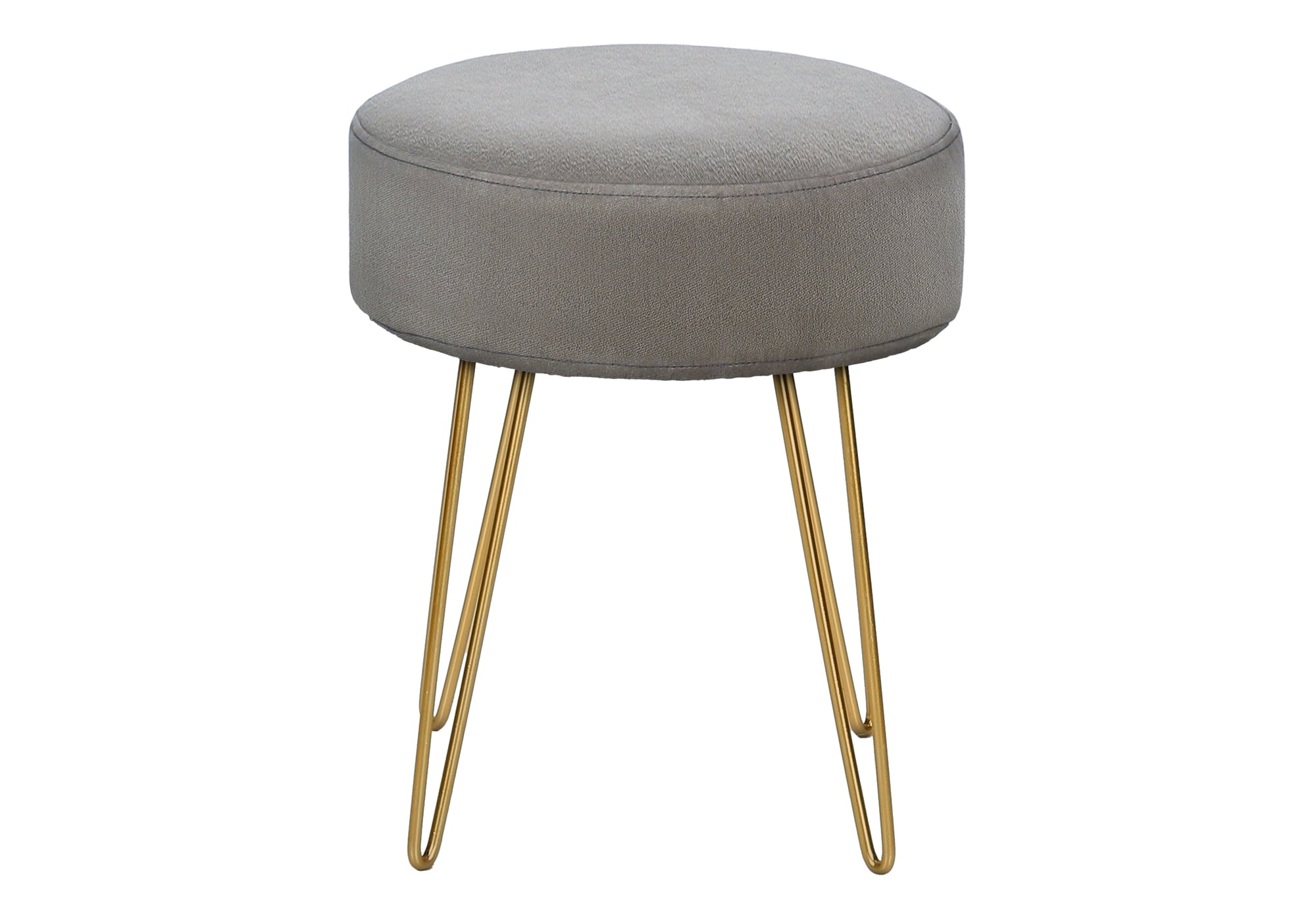 - Round ottoman with a padded seat for comfort and upholstered in a grey fabric with a plush texture
