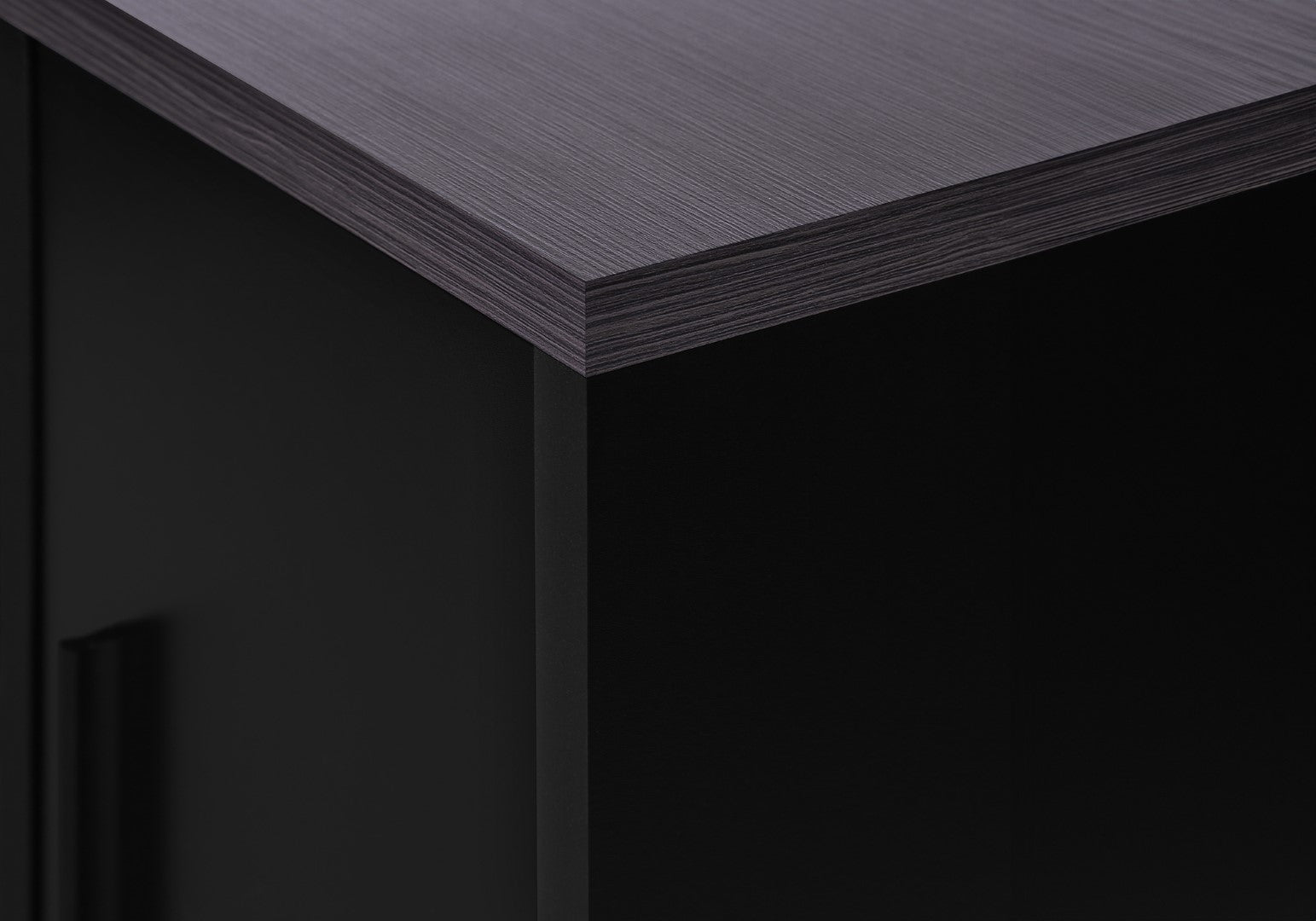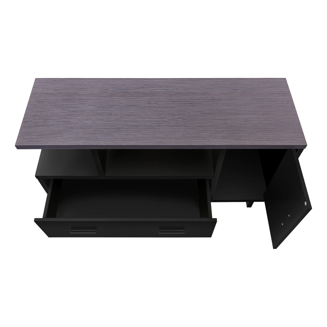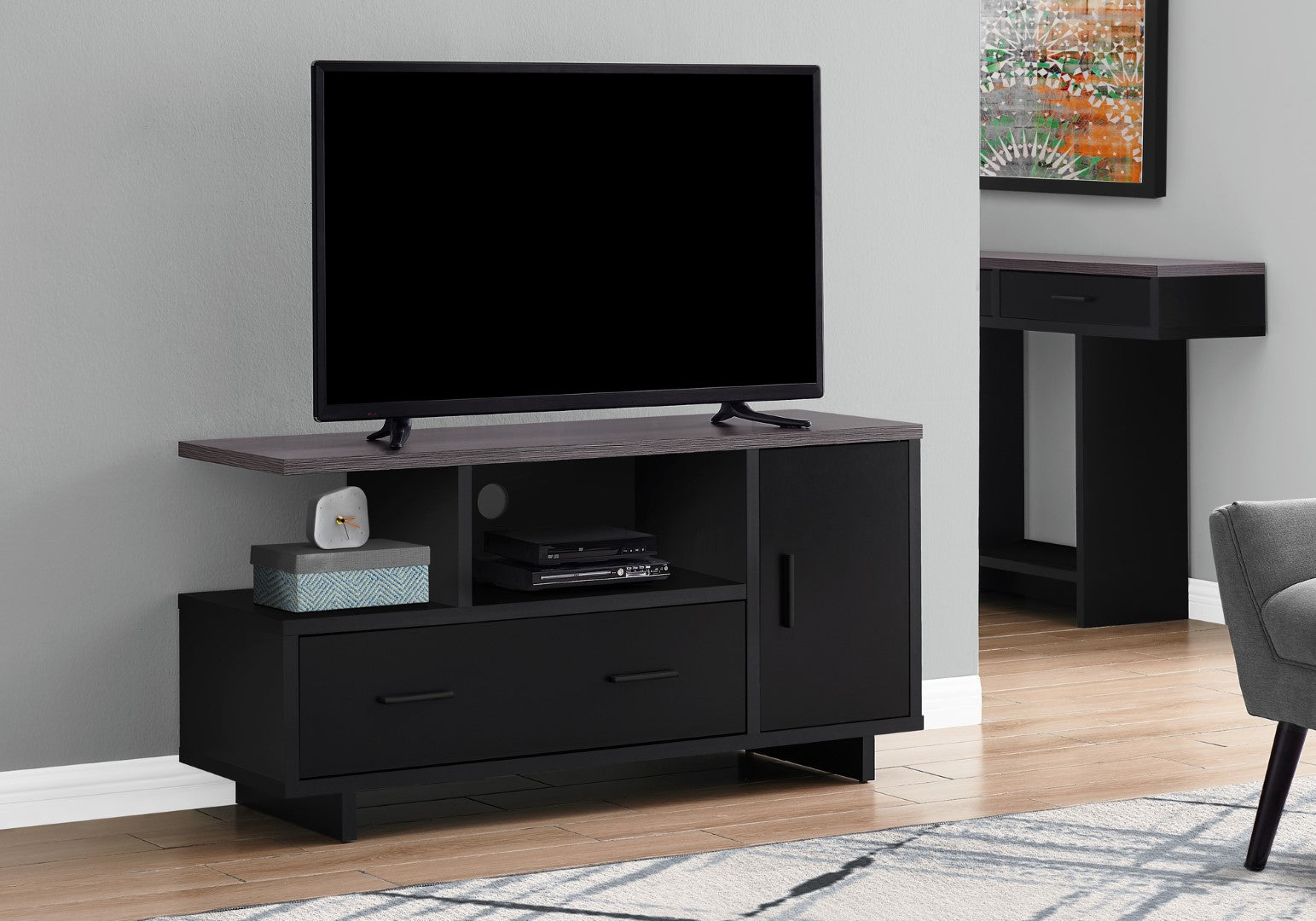 - Contemporary TV stand in a casual two-tone black and grey
