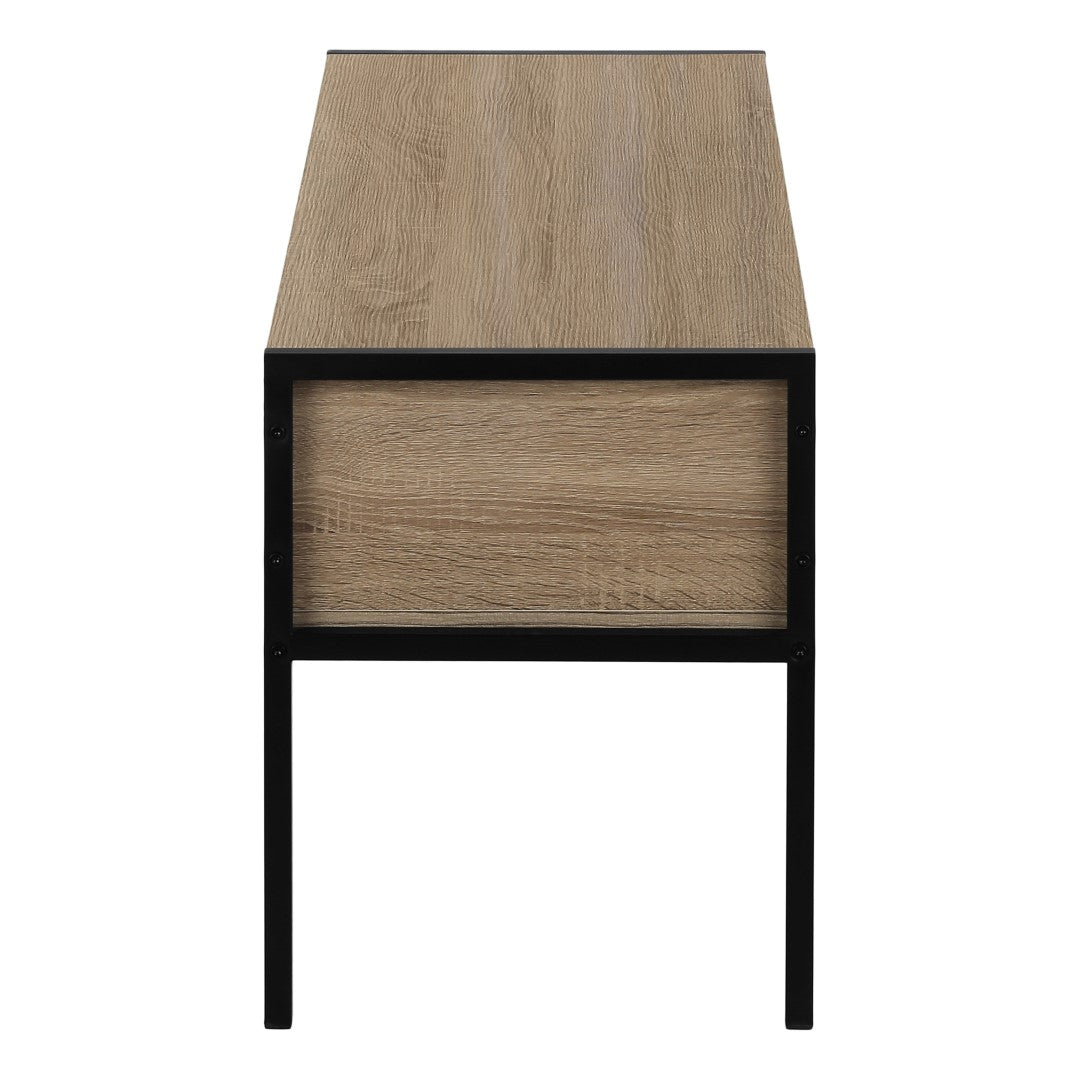- 48-inch TV stand in a dark taupe wood-look finish with a tall black metal frame accommodates most TVs when centered on the top panel