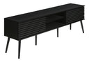 - This solidly constructed, contemporary 72 inch tv stand with a sleek black laminate finish on all sides is perfect for trendy living rooms or bedrooms.