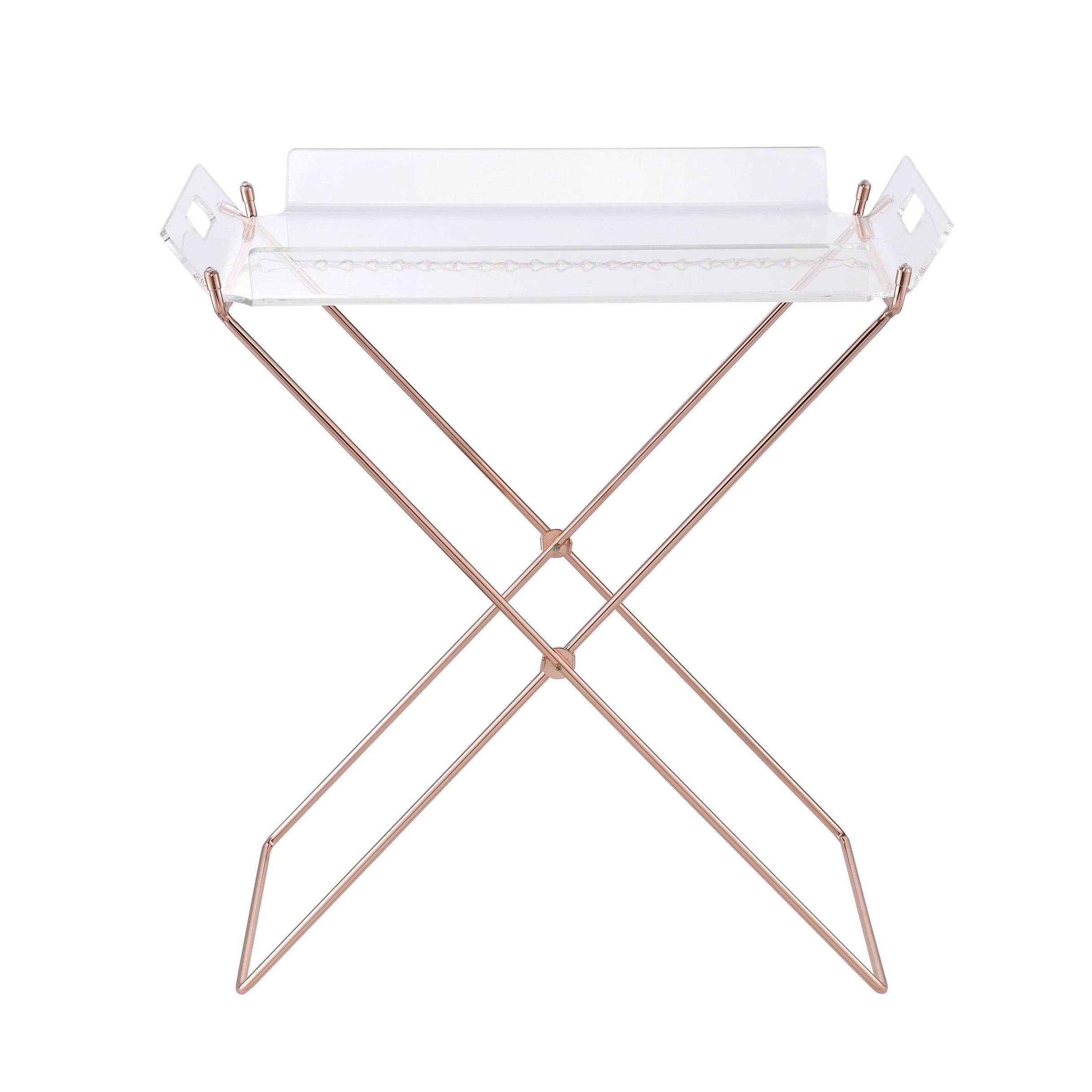 Add a touch of modern sophistication to any room with this versatile accent table. The clear acrylic tray top beautifully showcases decorative objects while the copper-finish cross sled base provides a chic contrast and dependable stability. Its lightweight, portable design makes it easy to move from room to room—perfect for use as a side table, bedside surface, or occasional tray table for entertaining.