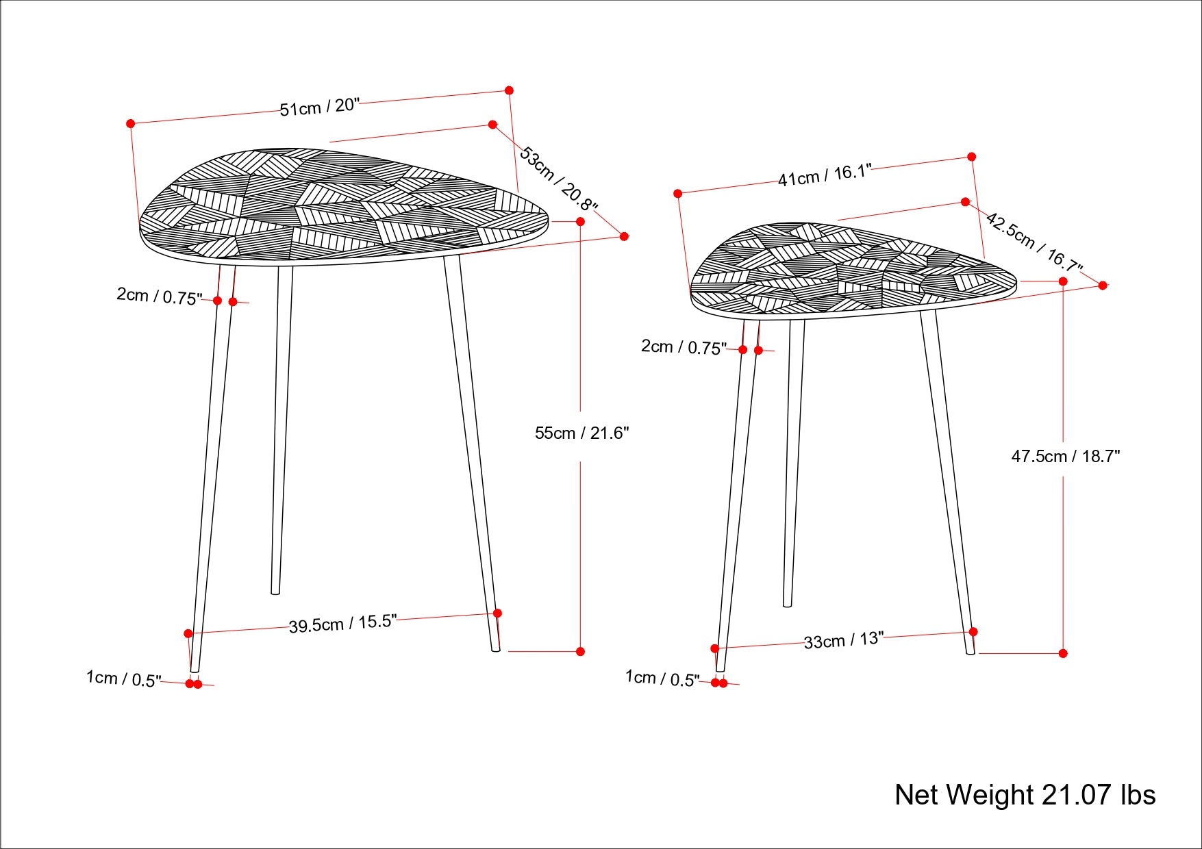 - Set includes: Two (2)Tables with etched geometric design on the tops and 3 legs