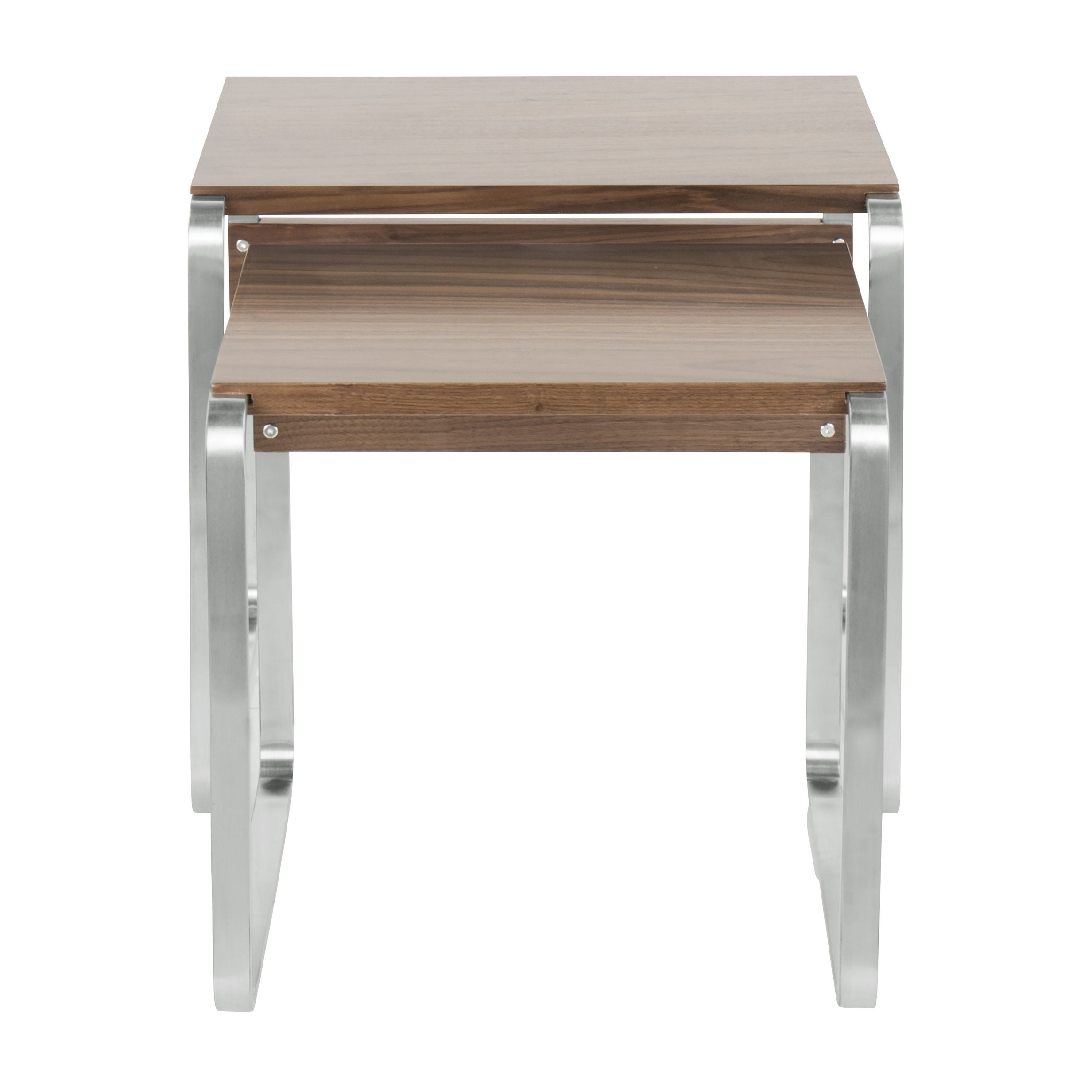 Bring effortless mid-century modern style and practical versatility to your living room, bedroom, or office with these Tea Side nesting tables from LumiSource. Designed to be both decorative and functional, the pair nests to save floor space or separates into two distinct surfaces for drinks, books, or decor. Warm walnut tops contrast with sleek stainless steel bases for a timeless look that complements a wide range of interiors.