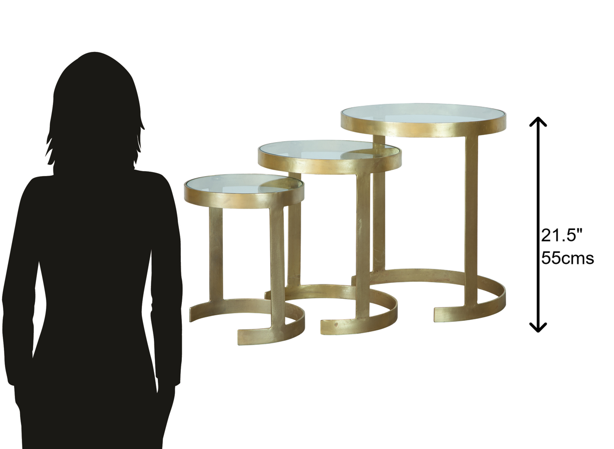 - Nest of tables include three round antique brass tables with glass tops that nest within each other.
