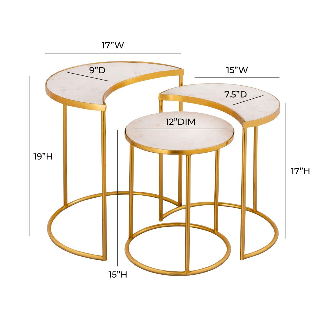 Give your living room a refined, contemporary upgrade with this set of crescent nesting tables. Handcrafted with genuine marble tops and a warm gold iron framework, the three-piece set combines sculptural styling with practical, space-saving function ” ideal for layering surfaces for décor, drinks, or extra tabletop space when guests arrive.