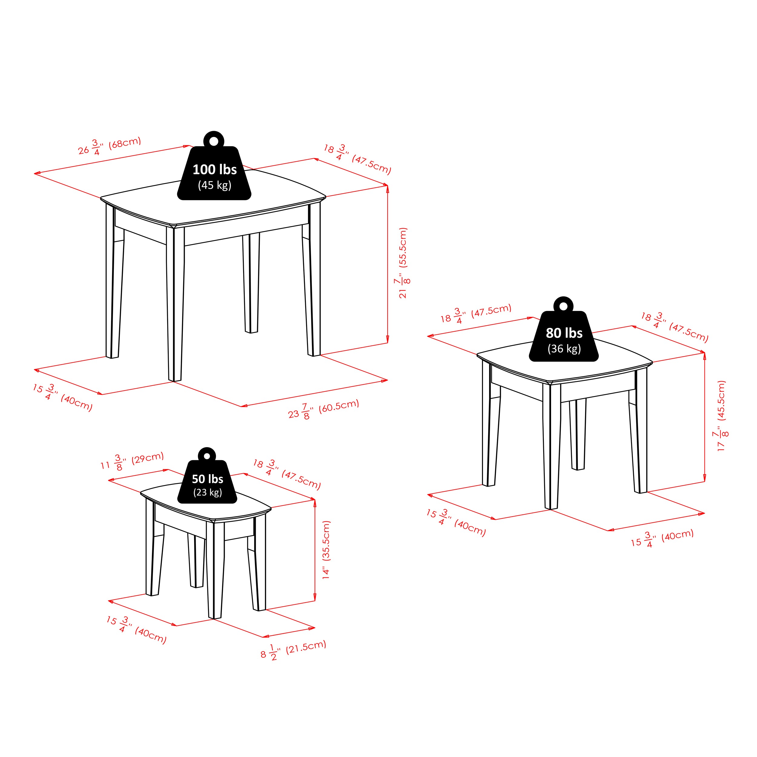 - Large: 26.8"W x 18.7"D x 21.9"H Med: 18.7"W x 18.7"D x 17.9"H Small: 11.4"W x 18.7"D x 14"H