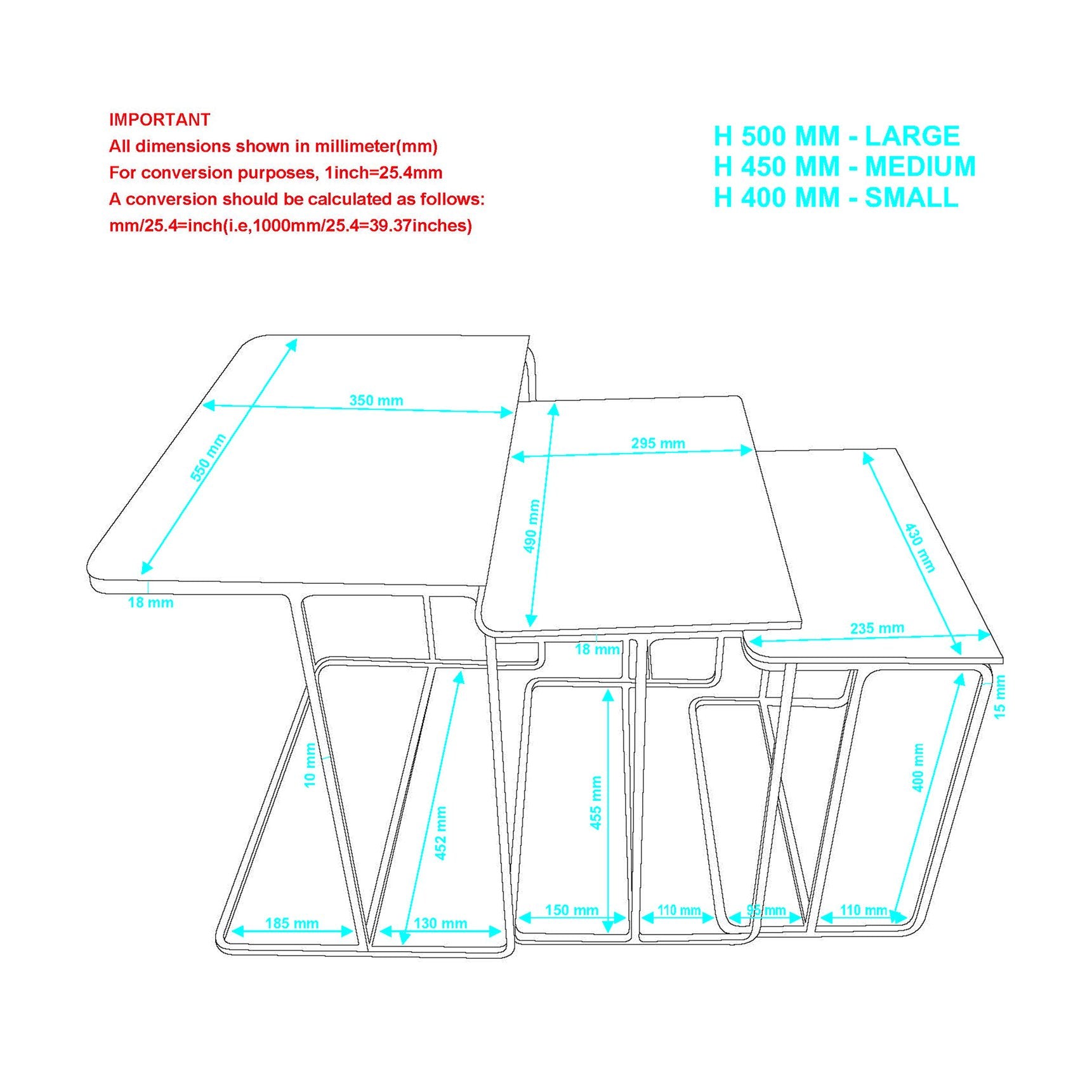 - 3-piece tables nest easily underneath each other