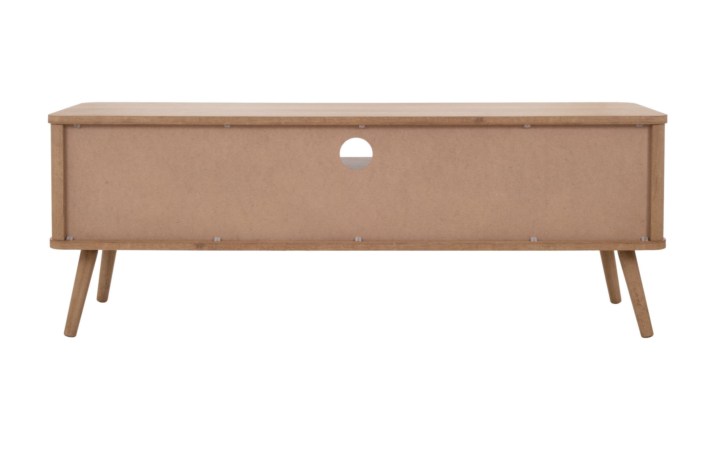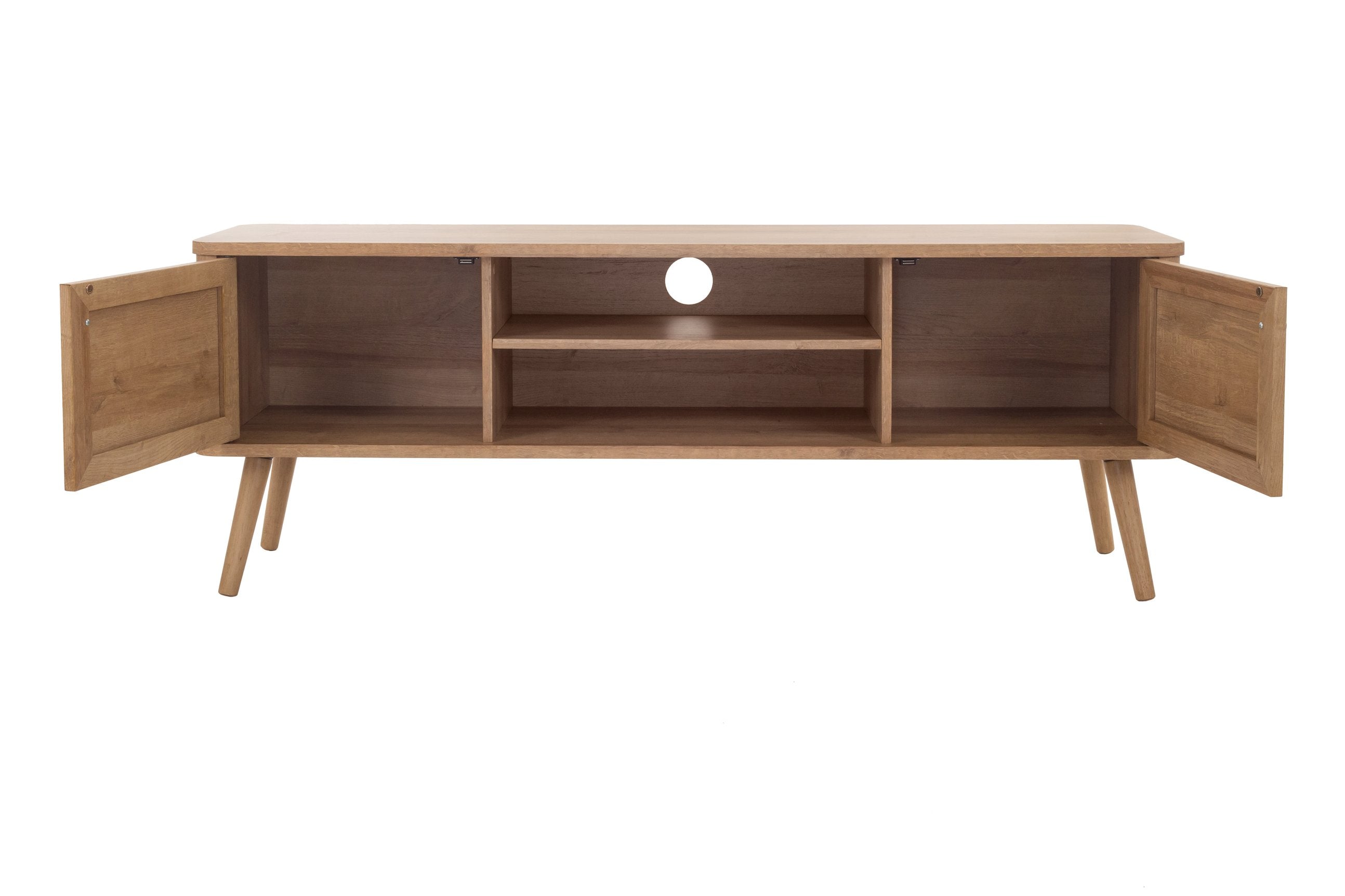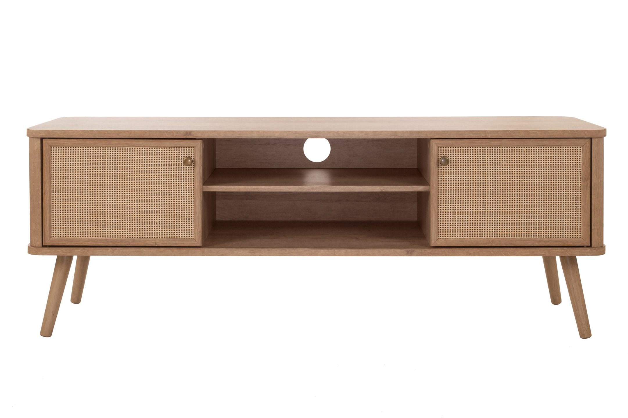 - Charming Mid-Mod Media Center features rattan swing door panels with one-removable and adjustable internal shelves in Natural Oak finish on sturdy, splayed solid Mahogany wood legs. Cable hole on the back panel provides organization and an uncluttered appearance.