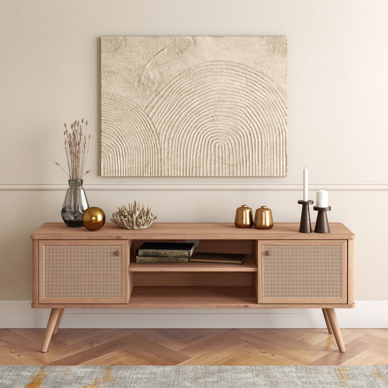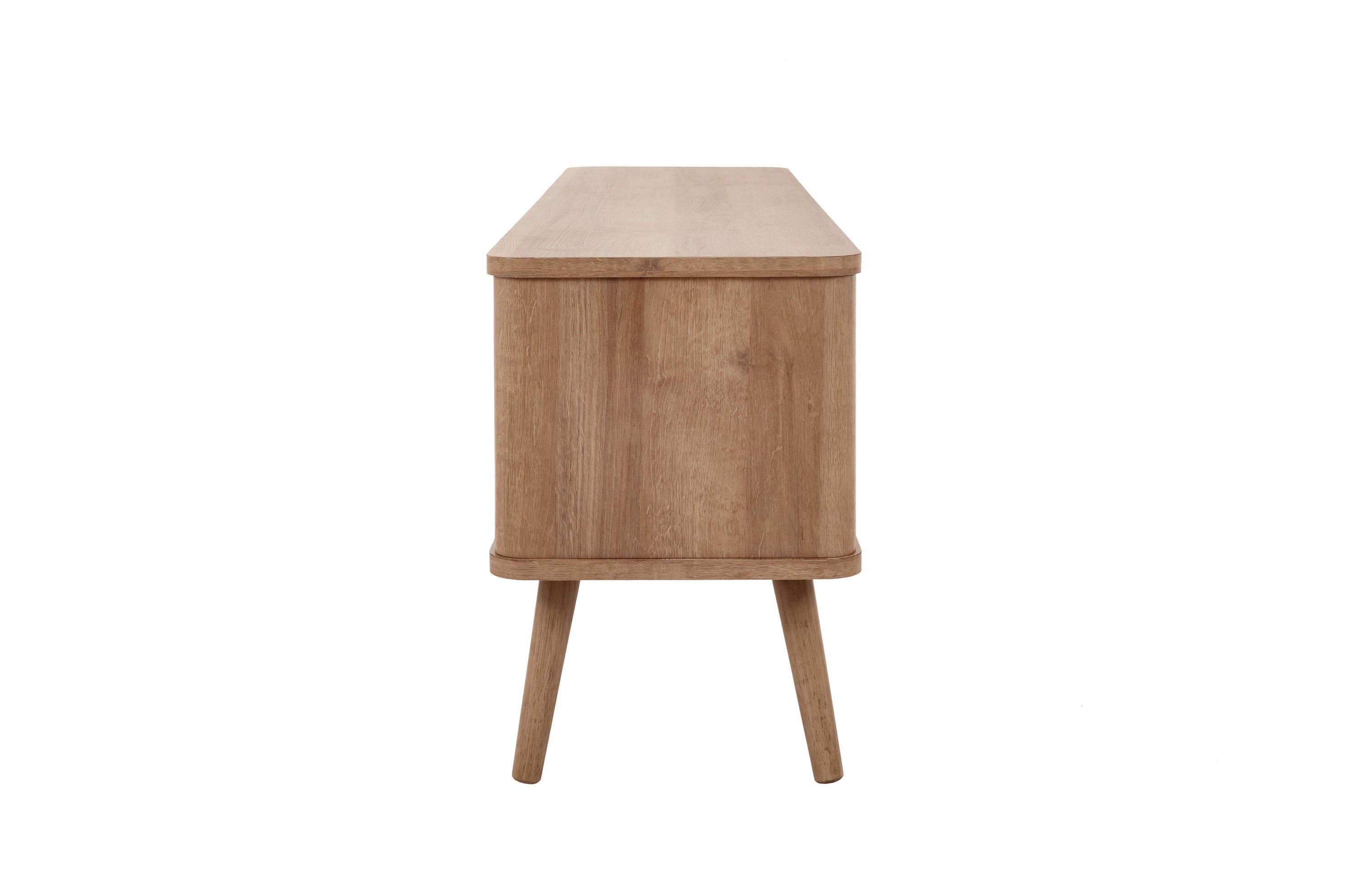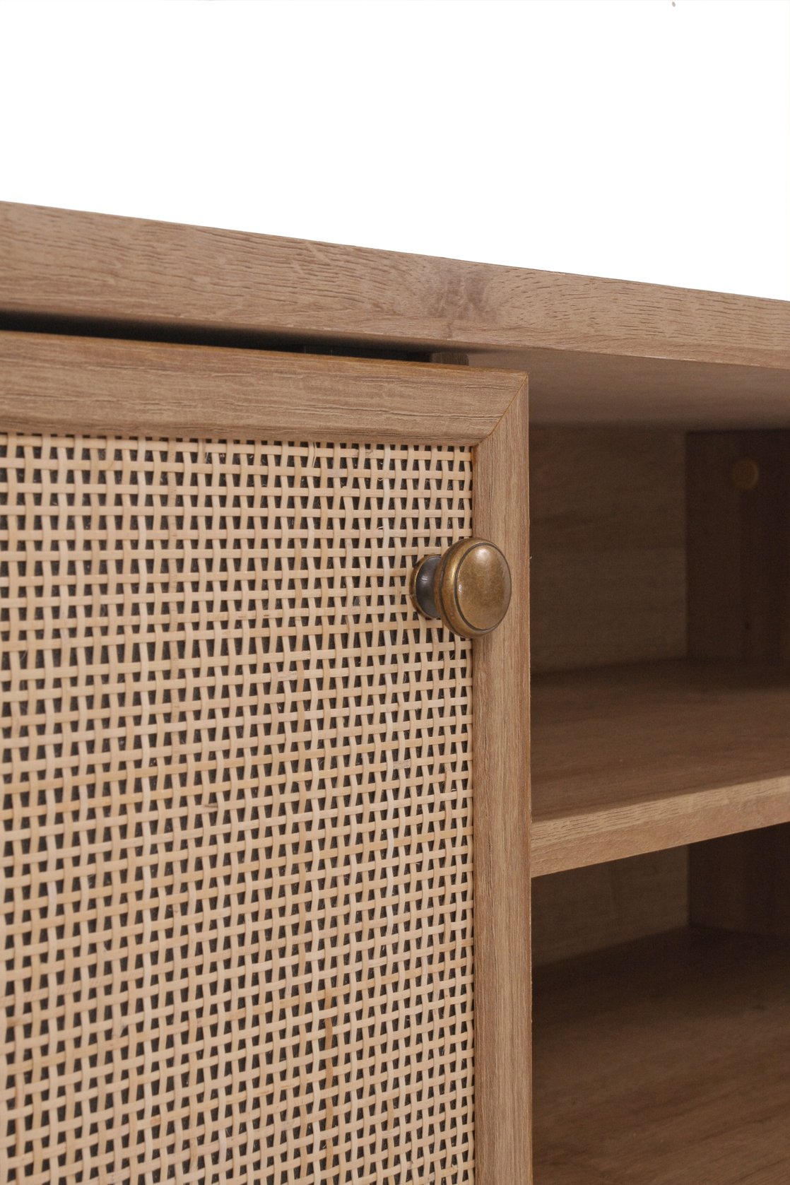 - Charming Mid-Mod Media Center features rattan swing door panels with one-removable and adjustable internal shelves in Natural Oak finish on sturdy, splayed solid Mahogany wood legs. Cable hole on the back panel provides organization and an uncluttered appearance.
