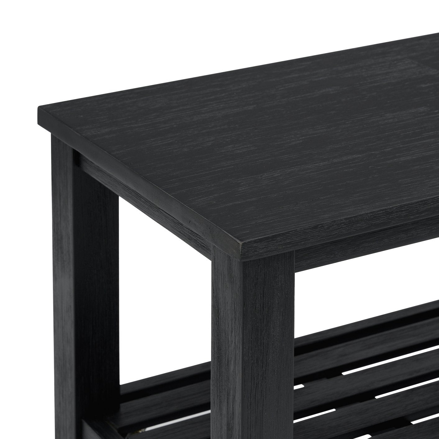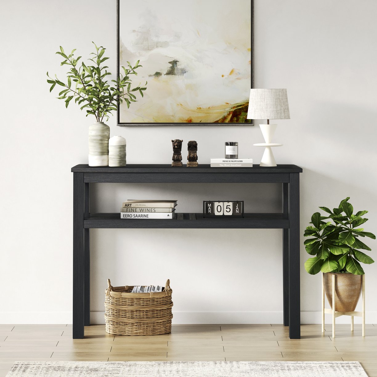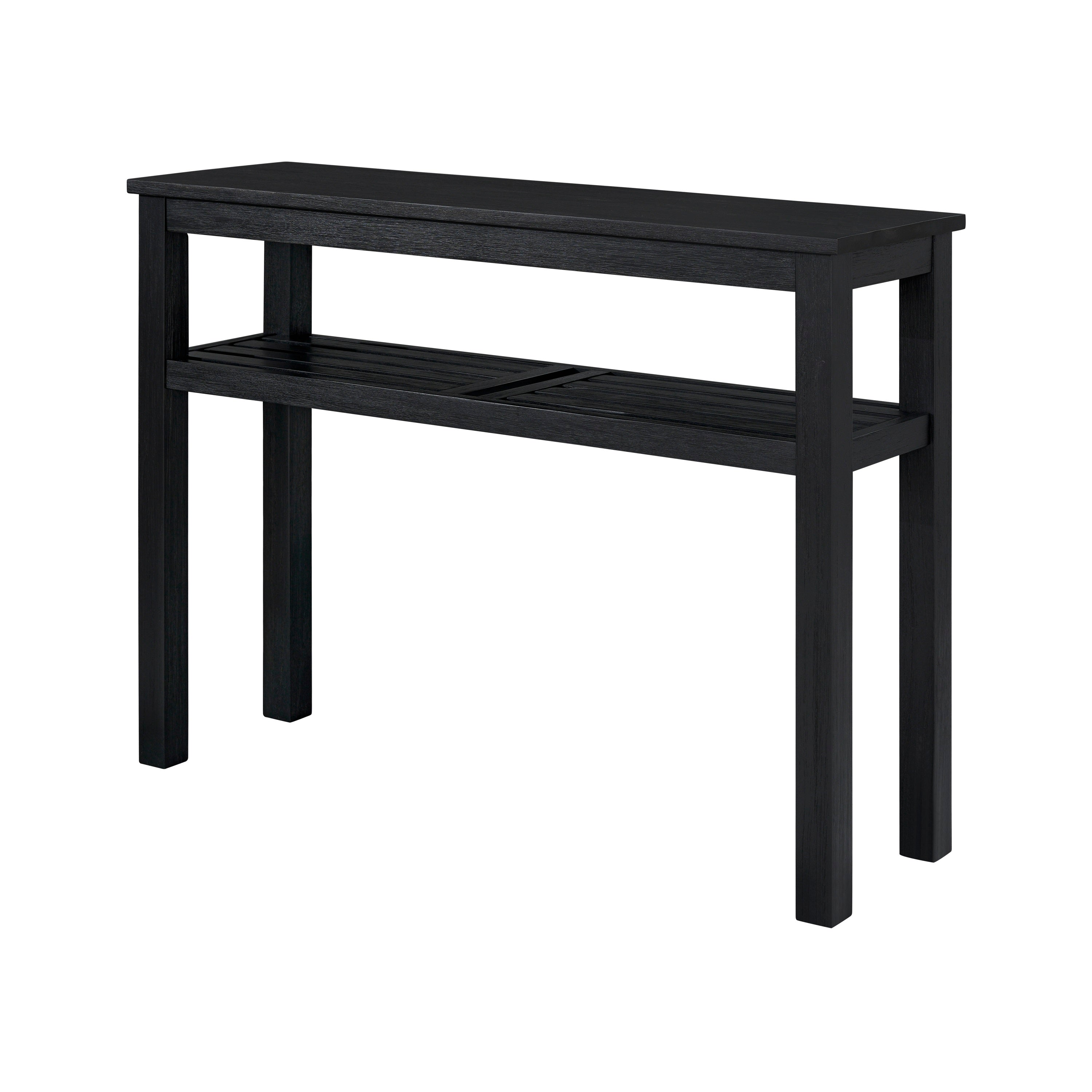- This simple form yet functional 2-shelf console is crafted of acacia wood. The sturdy wooden frame connects 2 wide planks providing spacious storage or display. The second shelf is designed with slatted planks to help organize and accommodate smaller size items. Matching coffee table and TV bench are sold separately.
