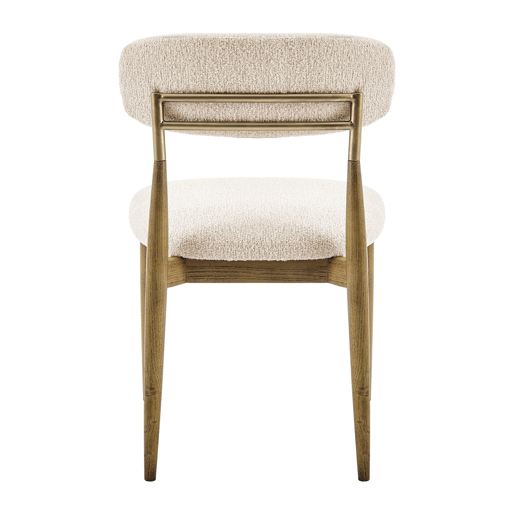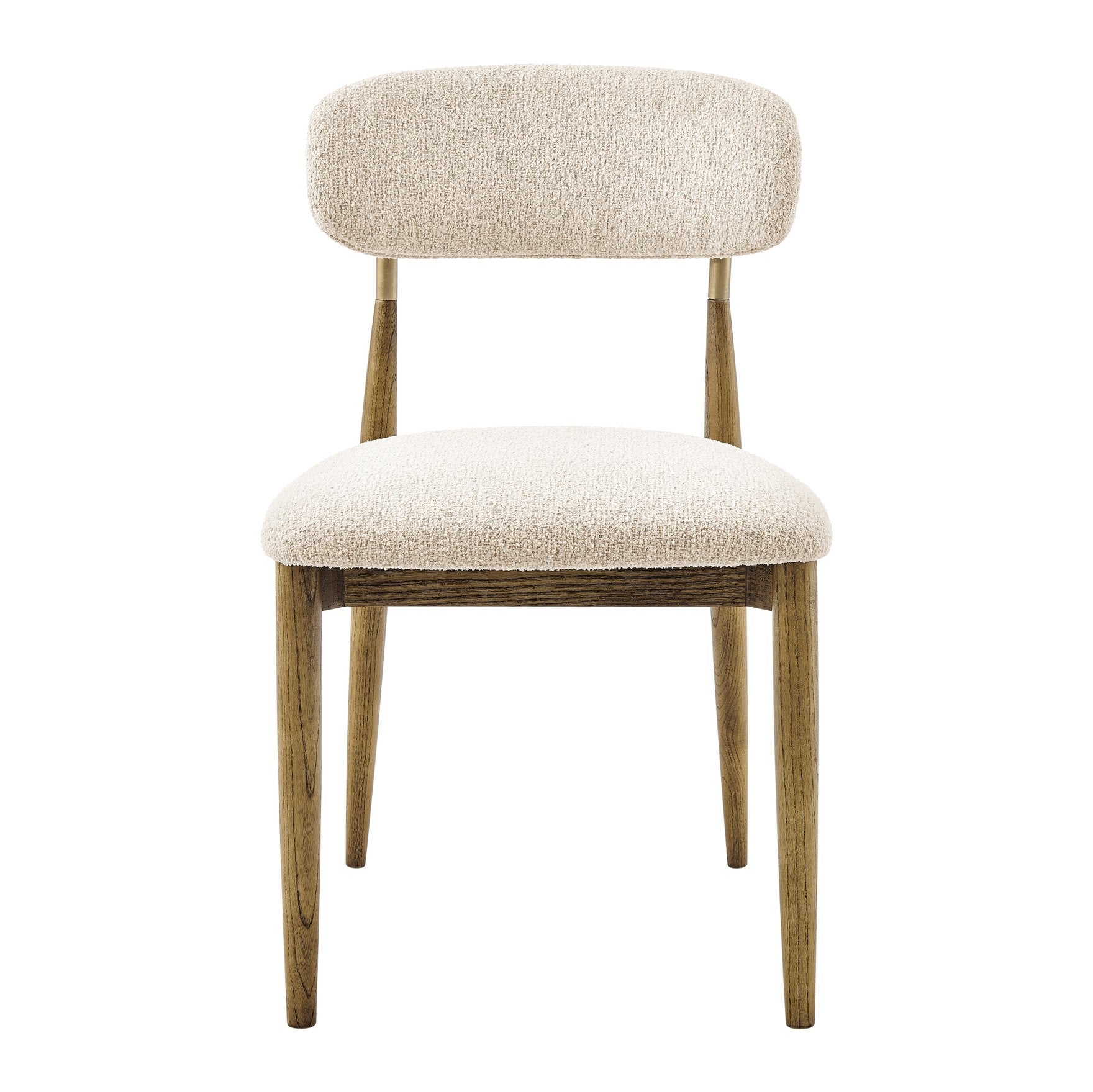 - Classic styling with a refreshing twist! This updated side chair features a curving backrest and tubular frame in a natural wood tone, embodying a beloved mid-modern style. Charming details like brass-capped backrest and easy-care fabric for high-traffic residential use add a modern touch to its timeless appeal. Plastic glides are included for floor protection.