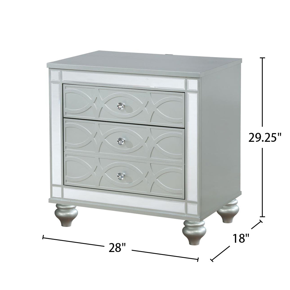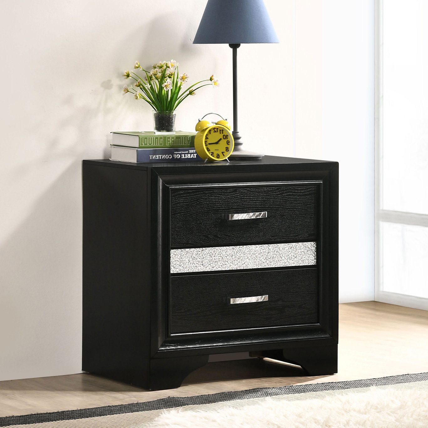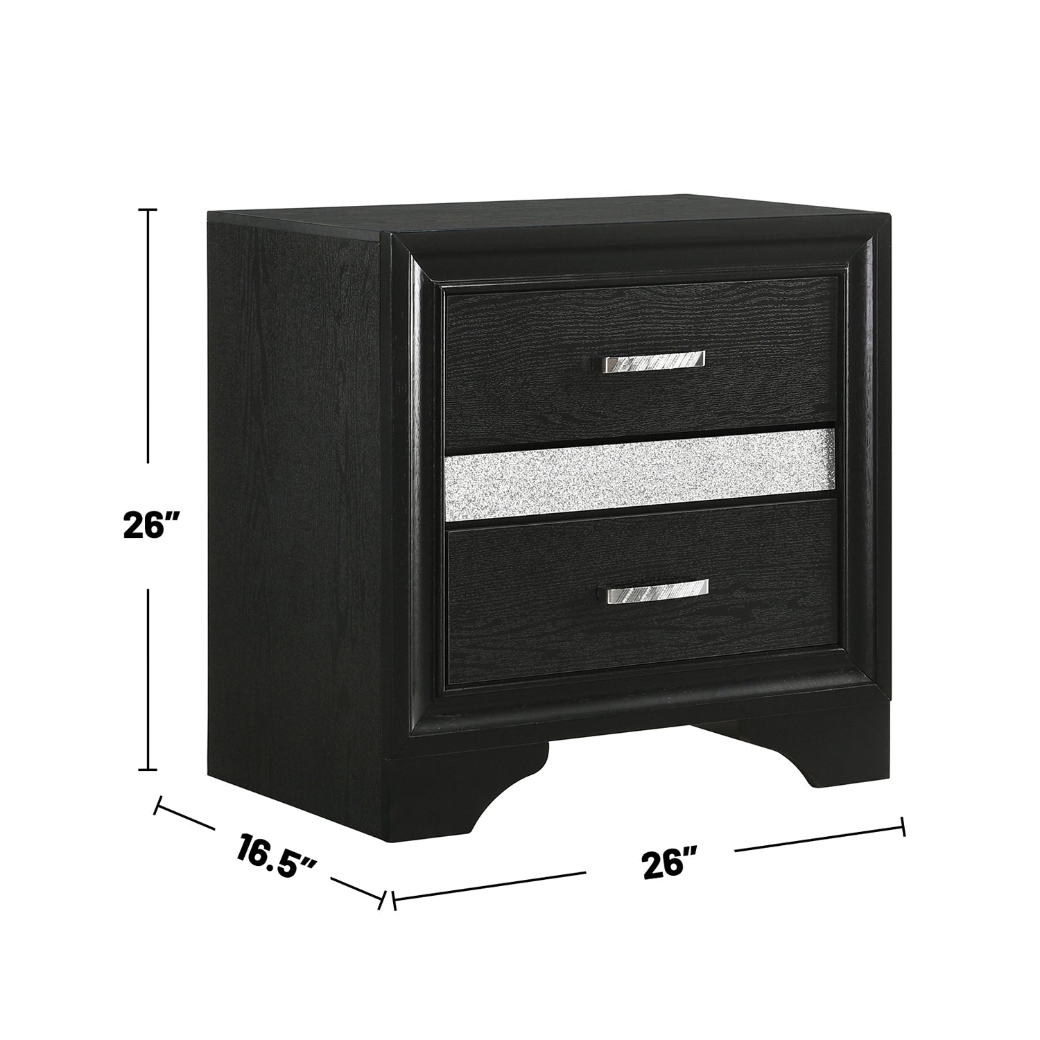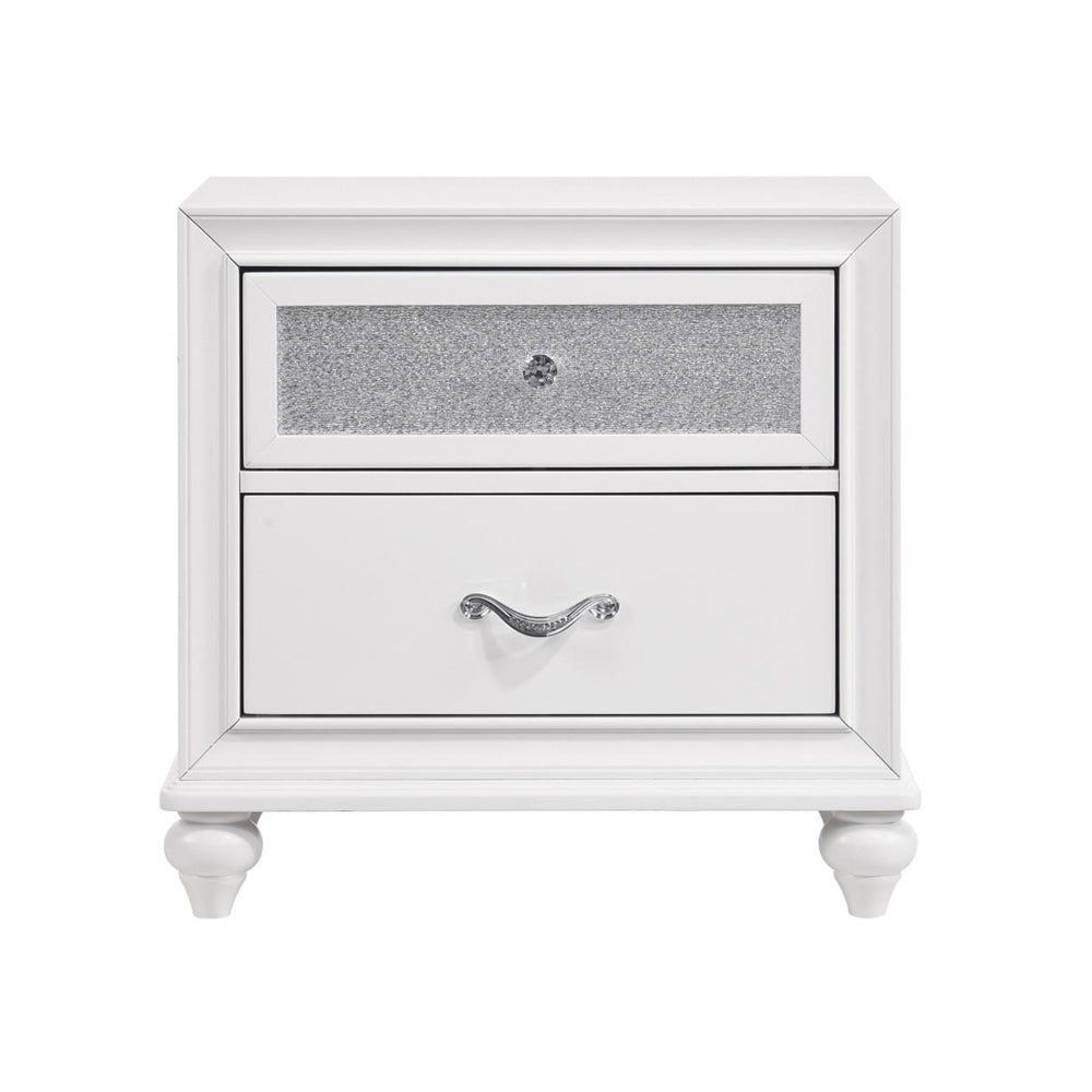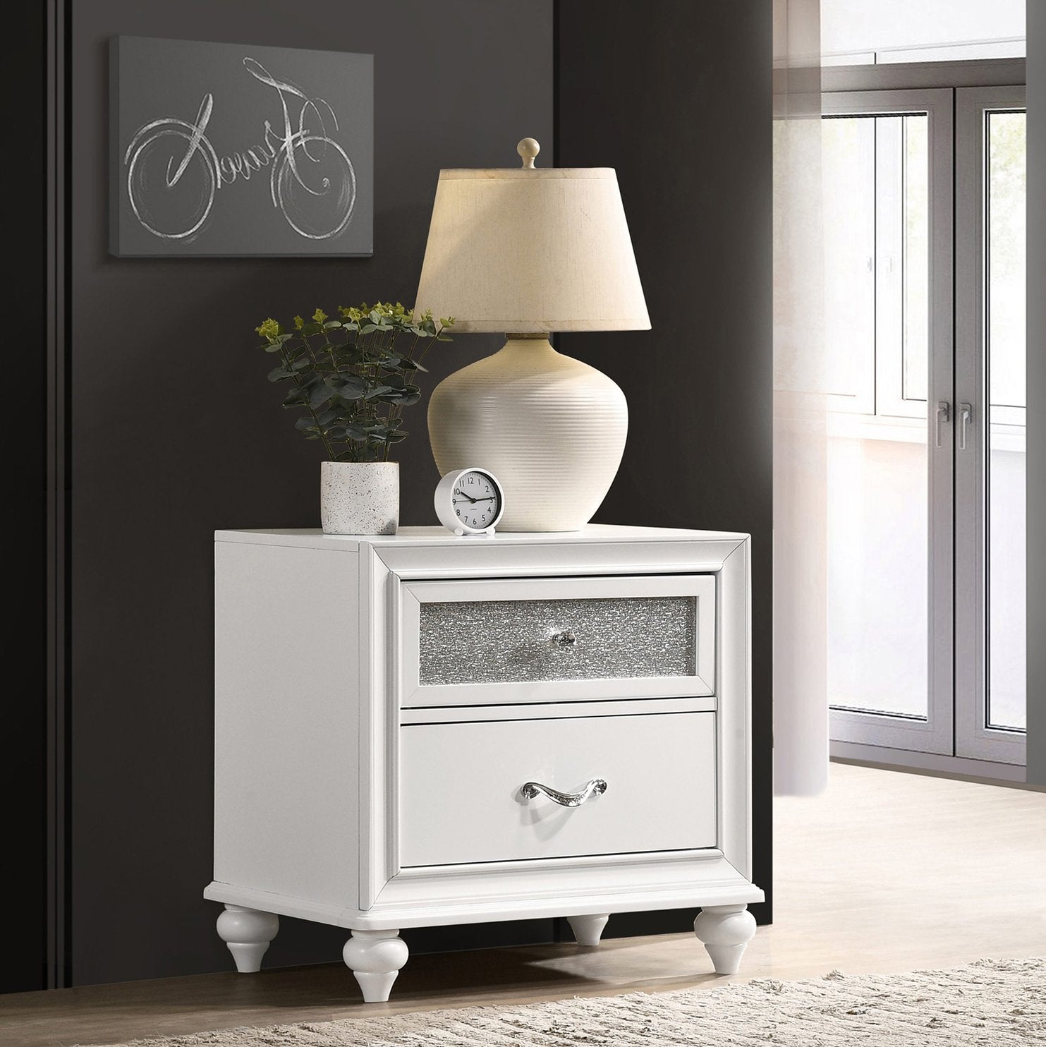 Add a touch of modern glamour to your bedroom with this elegant two-drawer nightstand. Clean white finishes, faceted crystal drawer pulls, and glitter-acrylic panels combine for a chic, upscale look while providing practical bedside storage for a tidy, organized space.