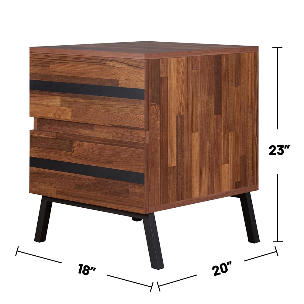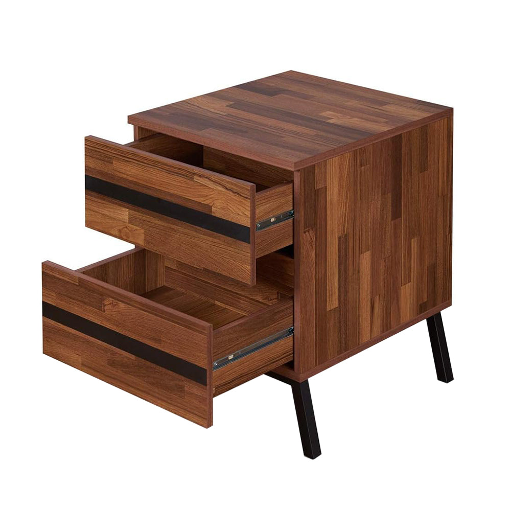 Elevate your bedroom with a refined nightstand that blends classic details and modern lines. Finished in rich walnut veneer and paired with sandy black metal legs, this two-drawer bedside table offers both style and practical storage for a clutter-free night routine. Its versatile design also complements matching living room pieces and can double as a small side or coffee table.