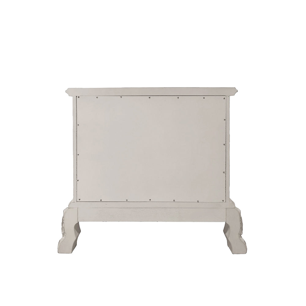 Bring timeless charm and practical storage to your bedroom with this classic two-drawer nightstand. The bone white finish, achieved through multiple hand-rubbed stain layers and hand sanding, highlights the wood’s texture and decorative carvings while offering a versatile look that complements both traditional and transitional interiors.