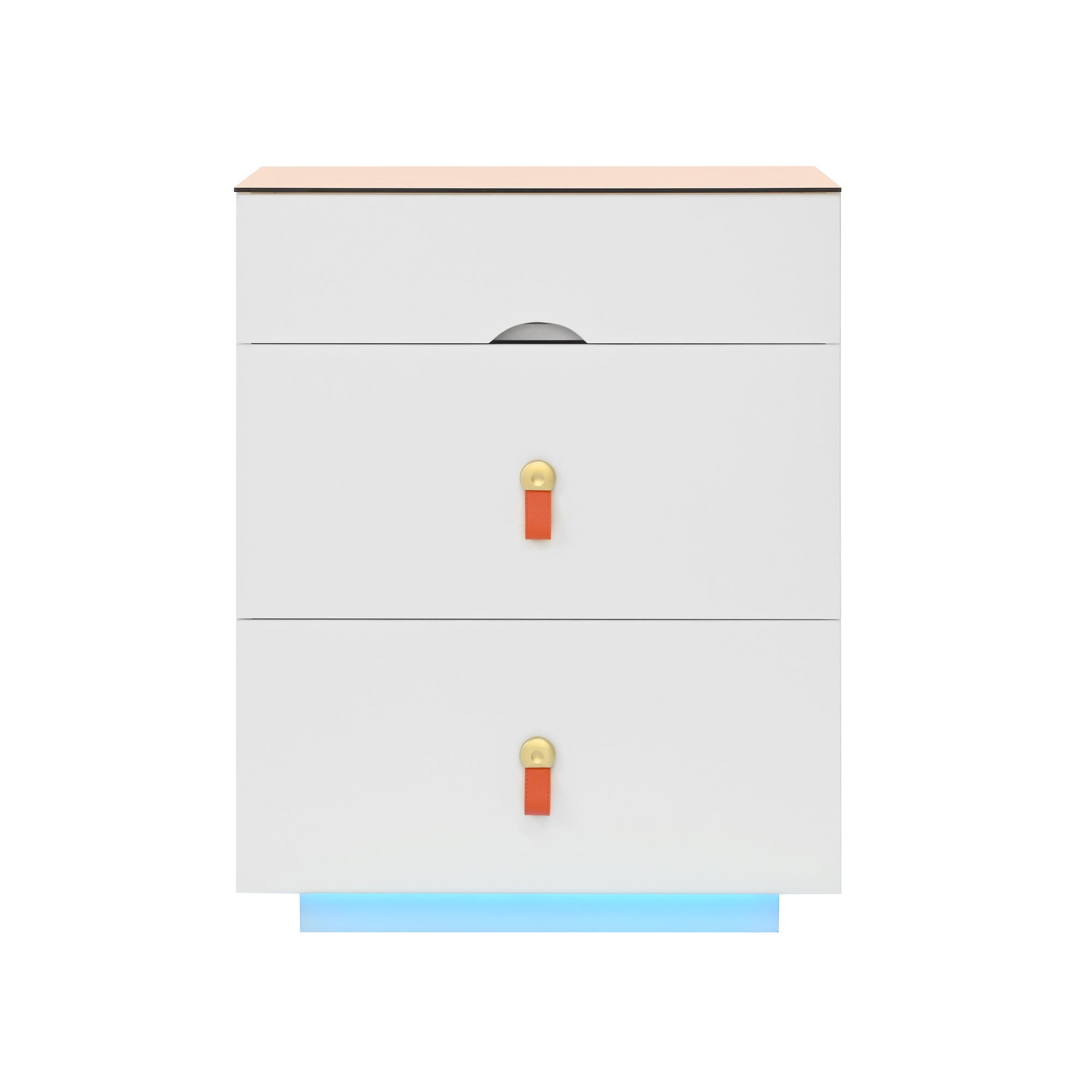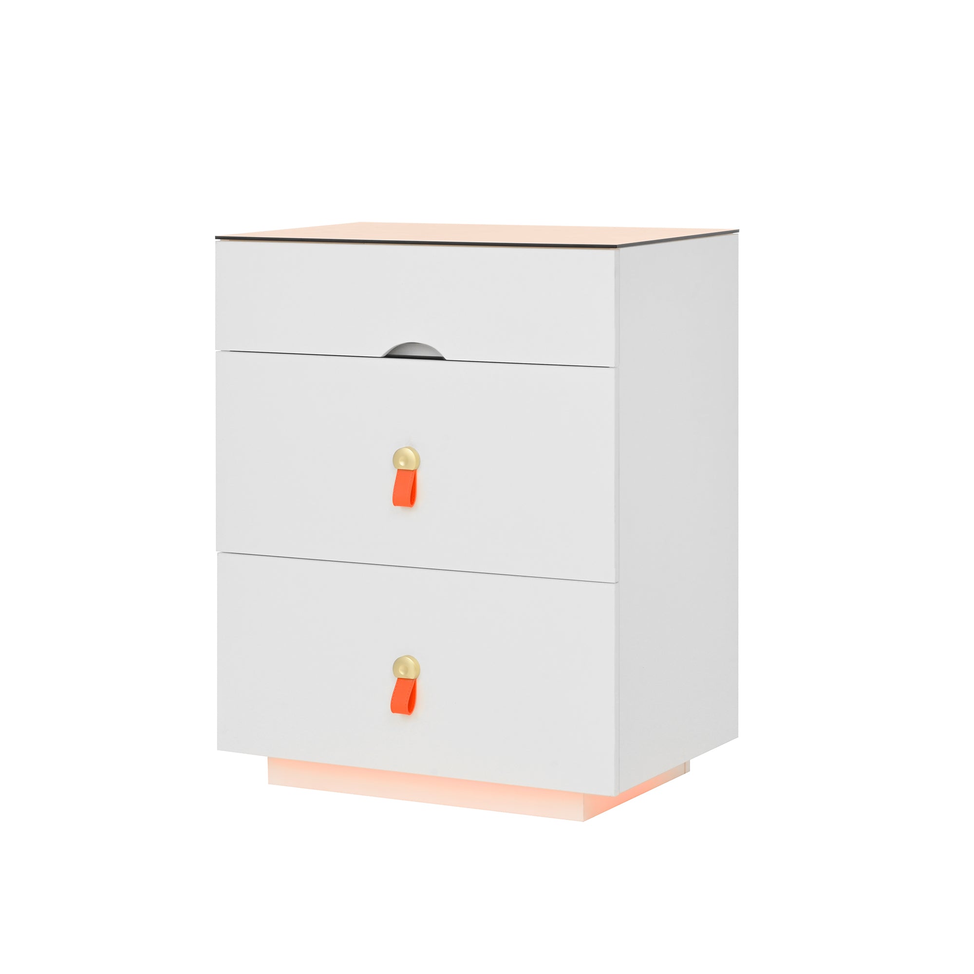 - 1.Nightstand with LED Light: This modern nightstand features an integrated ambient LED light strip at the base, adding a soft glow to your bedroom. Easily controlled by remote, you can switch colors to create the perfect atmosphere for reading, relaxing, or sleeping.