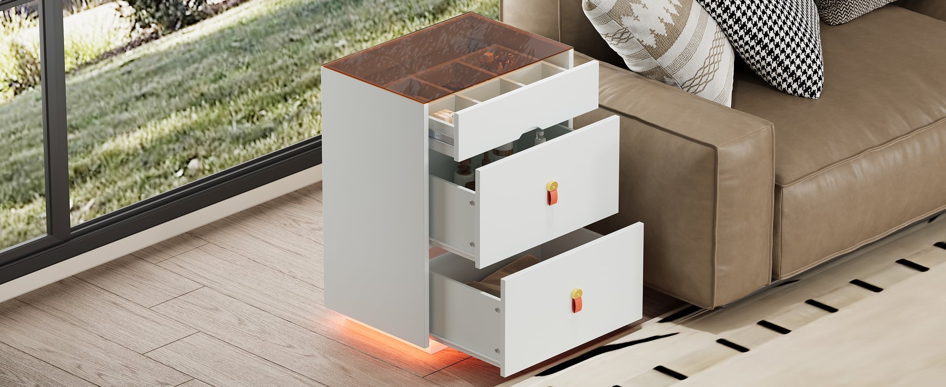 This contemporary nightstand blends sleek, modern design with practical bedside functionality. Designed for taller beds, it offers easy-access storage, a glass-top jewelry organizer, and integrated LED lighting with remote control—making it both a stylish focal point and a highly functional piece for the bedroom, living room, or cloakroom.