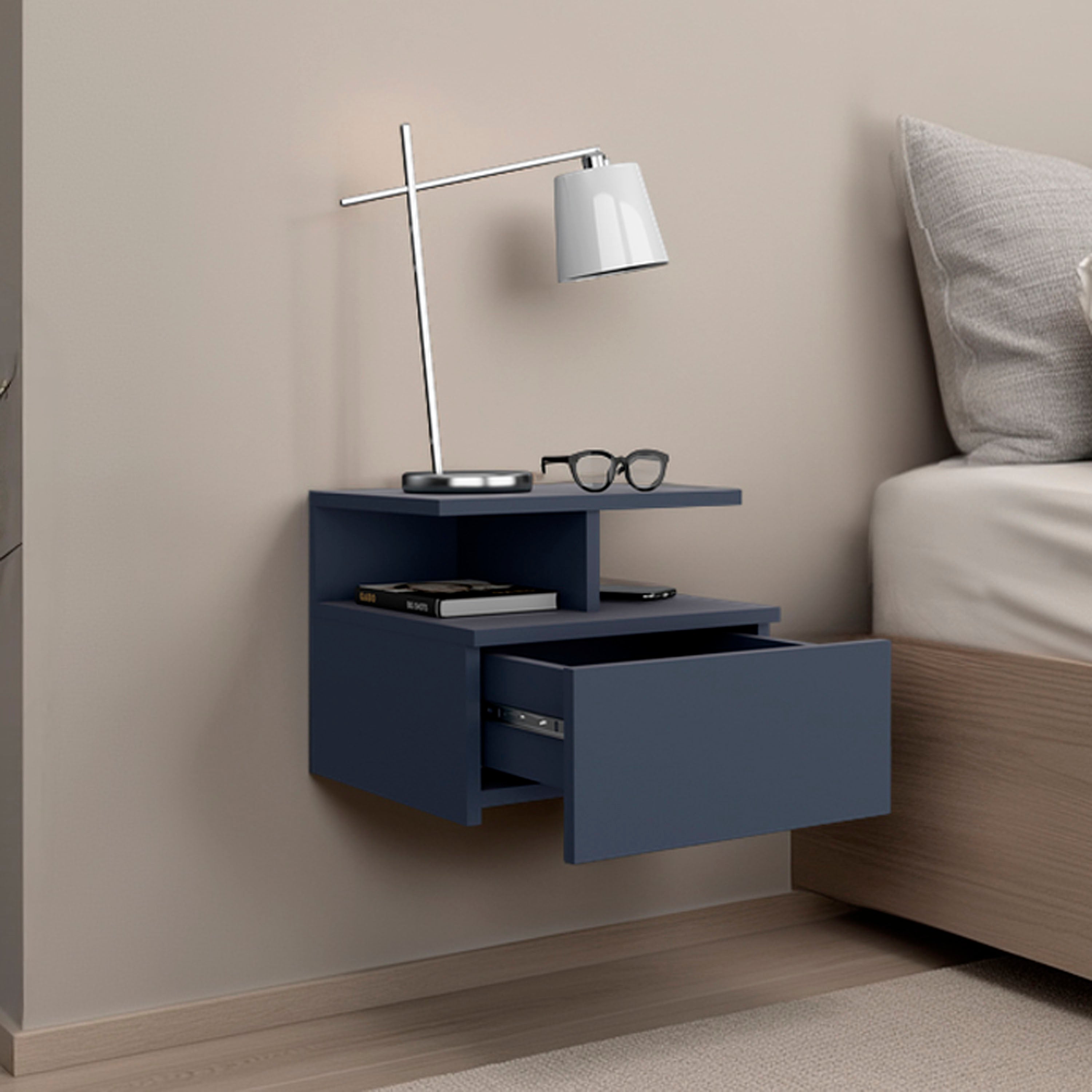 Add modern, space-saving style to your bedroom with this floating nightstand in a bold blue finish. Designed for compact rooms and clutter-free surfaces, it combines a roomy drawer and two open shelves to keep bedtime essentials within easy reach while creating a clean, contemporary look.