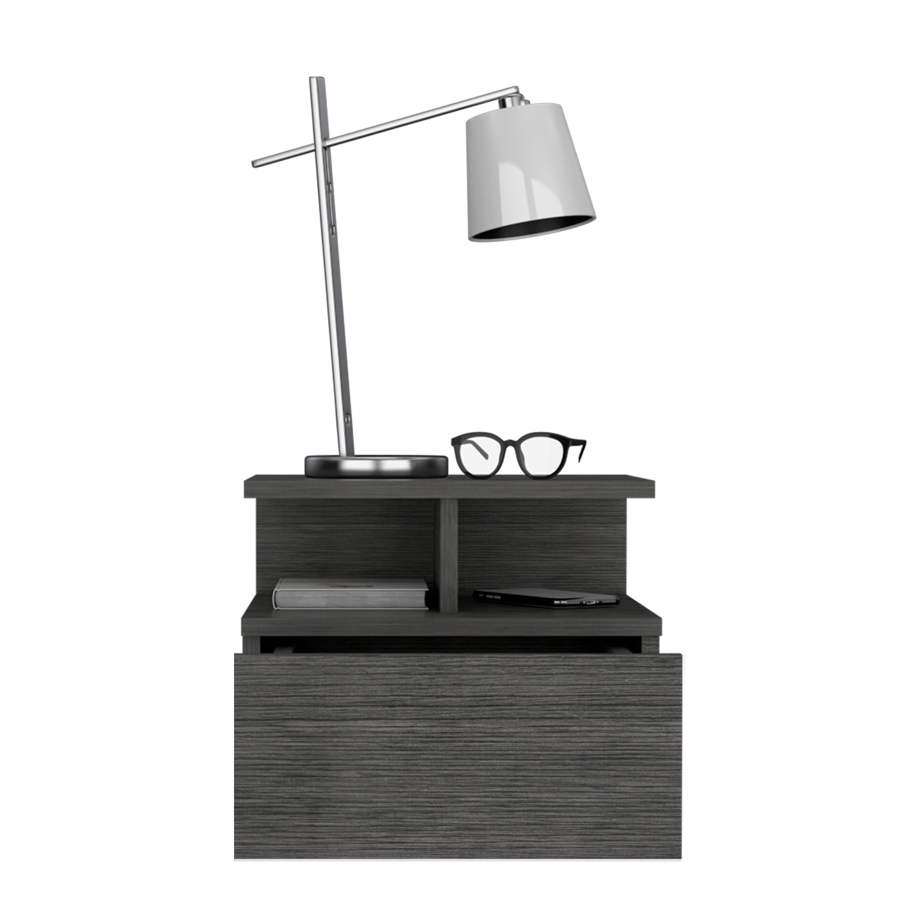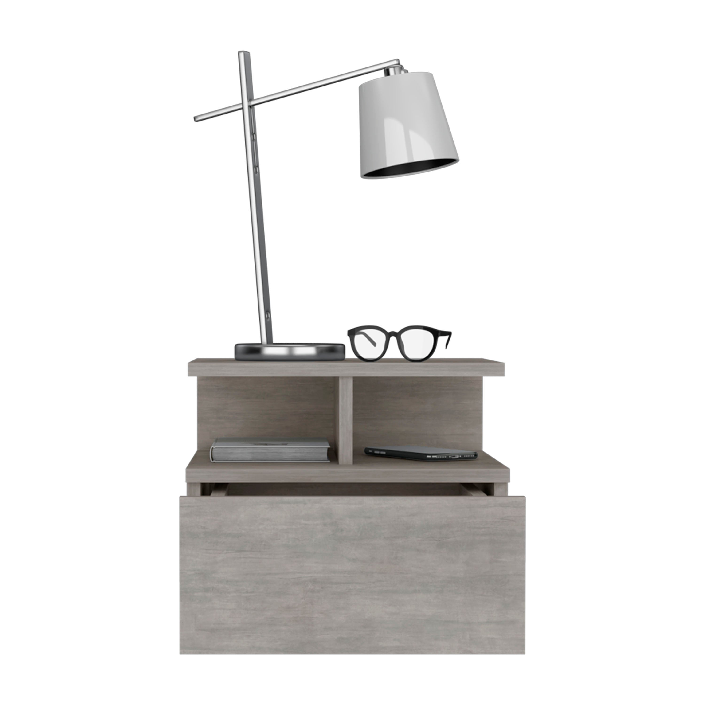 Give your bedroom a modern, space-saving upgrade with this floating nightstand that combines clean lines, practical storage, and easy installation. Crafted from durable engineered wood in a neutral grey finish, it tucks neatly against the wall to free floor space while keeping your nighttime essentials within reach.