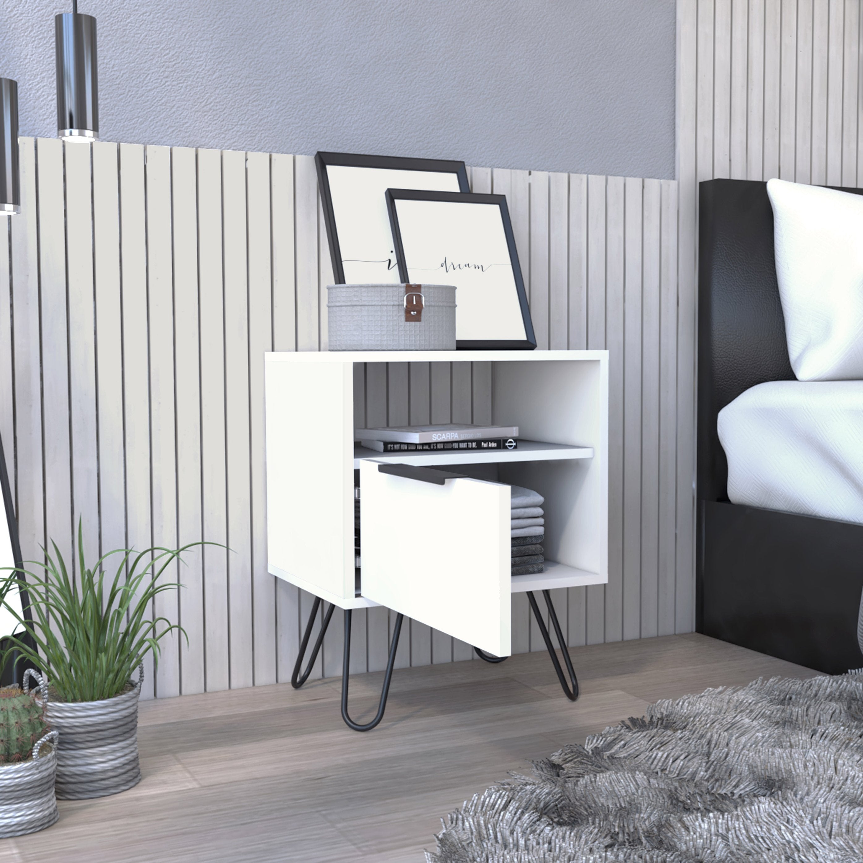 Bring modern flair and practical storage to your bedroom or living room with this sleek black two-drawer nightstand. Designed with hairpin legs and aluminum-profile handles, it pairs mid-century industrial aesthetics with everyday functionality — perfect as a nightstand, end table, or side table for compact spaces.