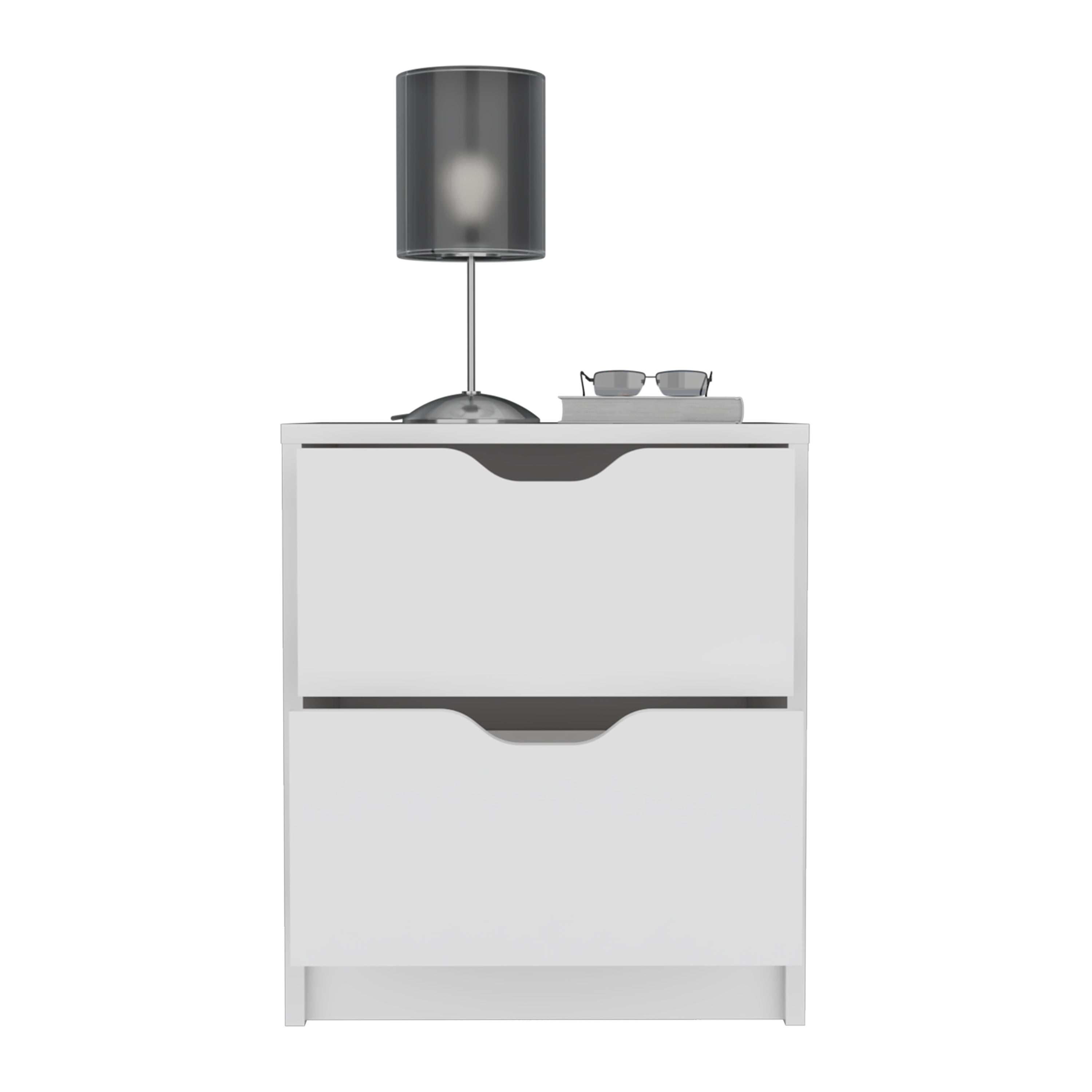 Delightfully compact and versatile, this Basilea two-drawer nightstand brings clean, modern style and practical storage to bedrooms, living rooms, or any small-space setting. Its handle-free drawer fronts, smooth sliders, and laminated particleboard construction combine a minimalist look with everyday durability, making it an ideal end table, side table, or bedside companion.