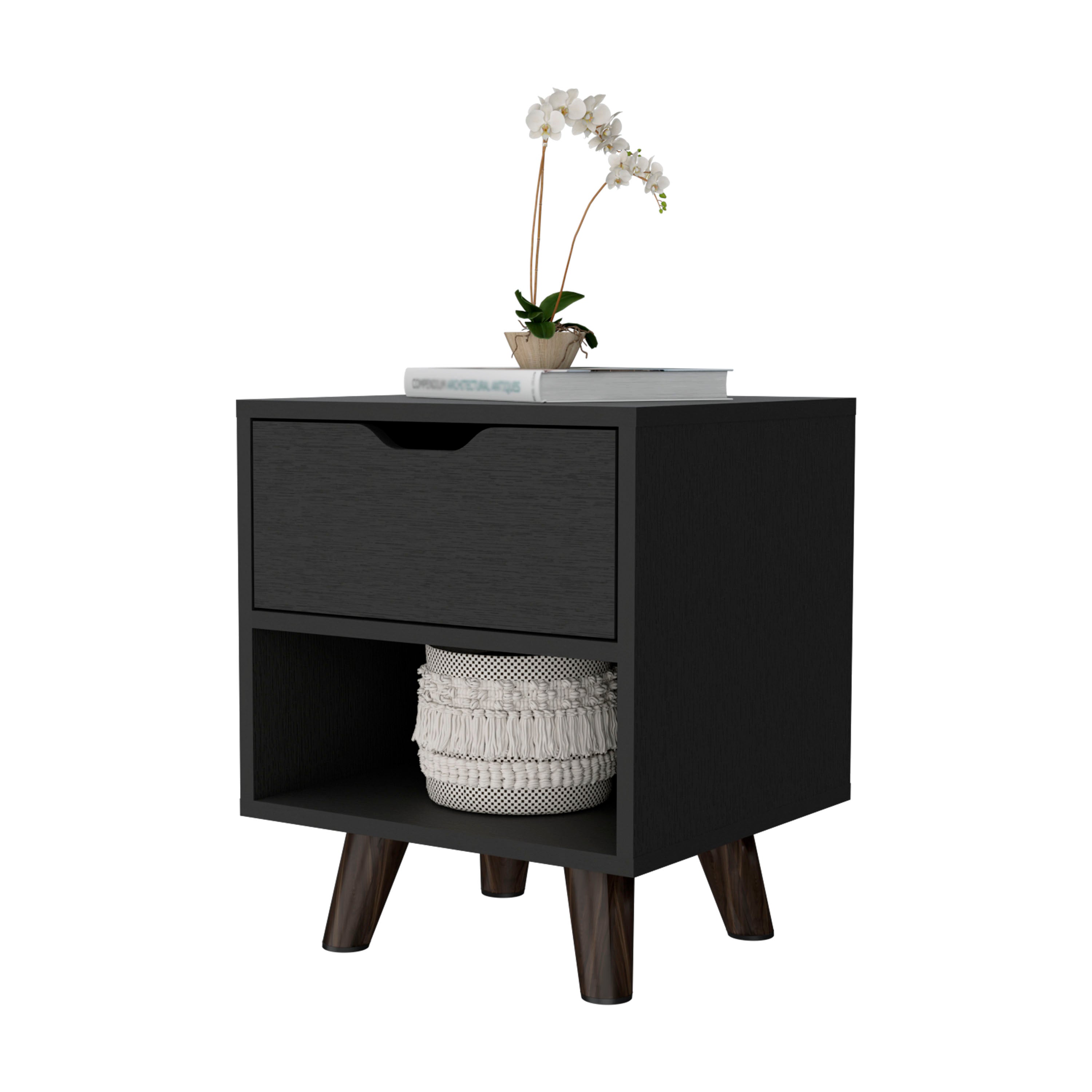 Bring modern functionality and clean style to your bedroom with this compact white nightstand. Thoughtfully designed for small spaces, it combines a hidden drawer and an open shelf to keep bedside essentials organized and within reach, while its engineered wood construction and wooden legs offer lasting stability and a subtle mid-century touch.